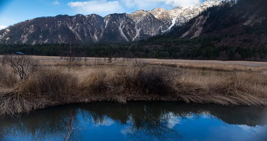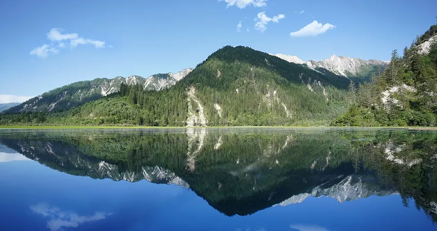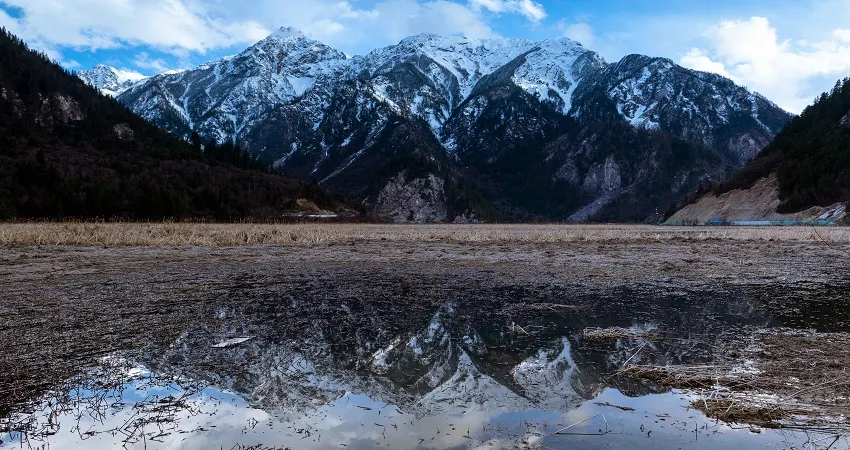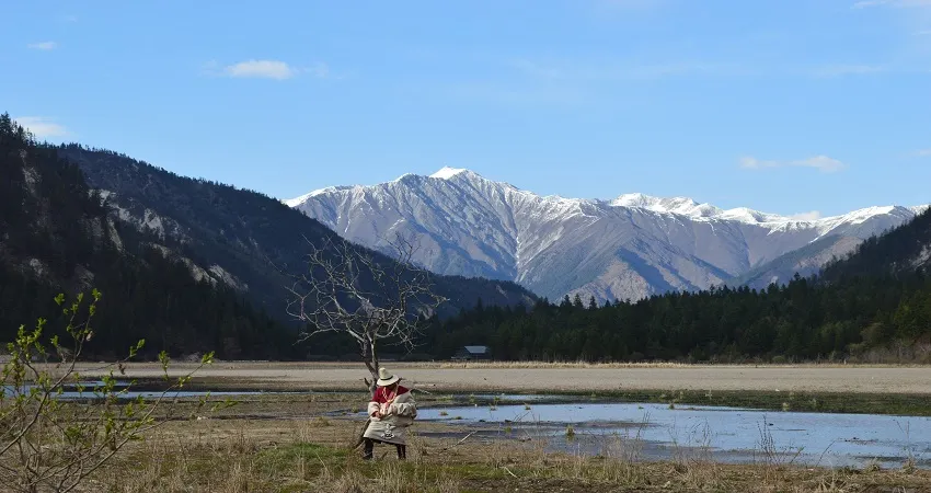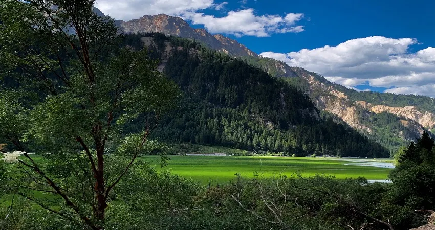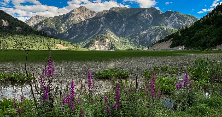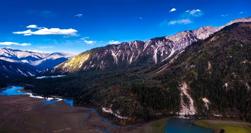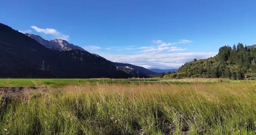 甘海子學名芳草海,位於松潘縣和九寨溝縣交界處的弓杠嶺,這裡原是一處高山湖泊,後因地質變化,出水口擴大,所以當地百姓俗稱“幹海子”。其實,“幹海子”並不幹,這裡四周遠山層疊,森林茂密,海子中溪水蜿蜒,芳草萋萋,如天鵝絨地毯鋪滿大地,夏秋季野花點綴其間,牛羊騾馬成群,冬春時則一片深黃,與周圍的雪山紅葉相映成趣。因此,人們逐漸就把“幹海子”叫成了“甘海子”。
