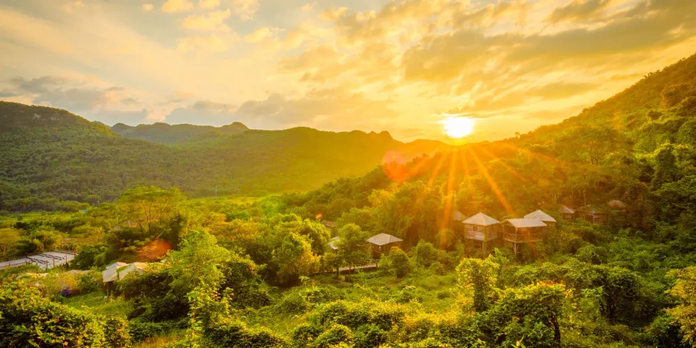 英德九州驛站位於英德市堯山腳下,景區主要有由樹屋村、樹上溫泉及天門溝景區組成。這裡樹木茂密,有群山、飛瀑,一派原始風光,空氣也格外清新。在這裡可以登山健身,挑戰攀索等項目,還可以享受獨特的樹屋和樹上溫泉的樂趣。