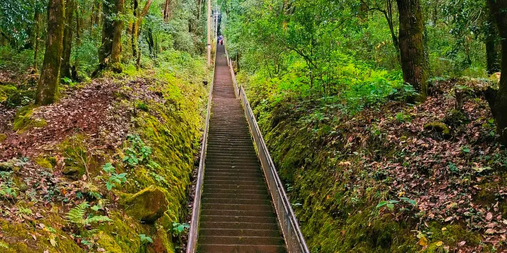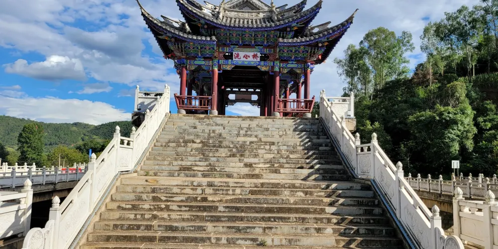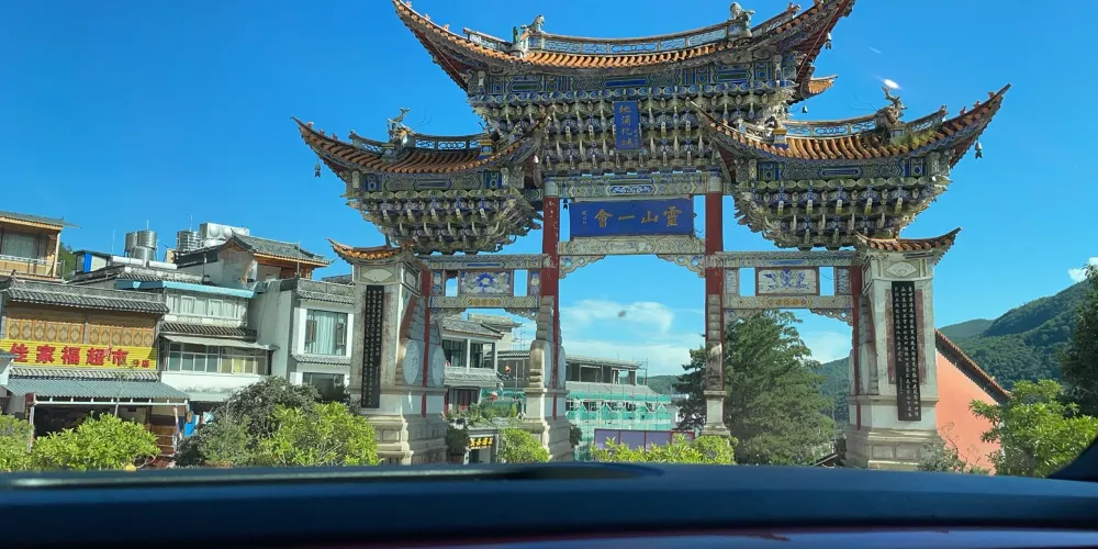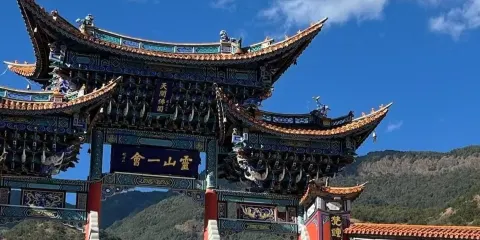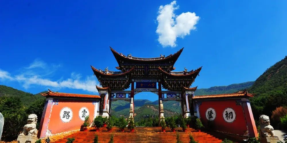 則評價位於雞足山南麓,有座一高兩矮牌樓式的建築,中坊上鑲有全國佛教協會主席趙樸初撰題“靈山一會坊”匾額,左右兩坊分別是“天開佛國”及“地湧化城”。此牌樓是雞足山的山門總坊,過了“靈山一會坊”,初登雲路,朝山就從這裏開始了。