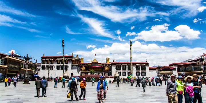 大昭寺,藏語為“覺康”,又名“祖拉康”,是藏傳佛教信徒朝拜的終點,在他們的心中,大昭寺之神聖,並不遜於布達拉宮。不論從地理位置上,還是在藏傳佛教信徒的心目中來説,大昭寺都是名符其實的藏傳佛教聖地和中心,在藏傳佛教史上擁有極其崇高而聖潔的地位。大昭寺始建於公元七世紀中葉,是藏王松贊幹布為了安放其王妃尼泊爾尺尊公主,從家鄉加德滿都帶來的釋迦牟尼8歲等身佛像而建,公元1409年,格魯派創始人宗喀巴大師在大昭寺宏揚佛法,舉行傳昭大法會,從而奠定了其在藏傳佛教史上的重要地位。公元八世紀,大唐文成公主入藏時從長安帶來的釋迦牟尼十二歲等身像供奉於大昭寺內,成為大昭寺的鎮寺之寶,是遊客及前往朝拜的人必不可錯過的看點之一。