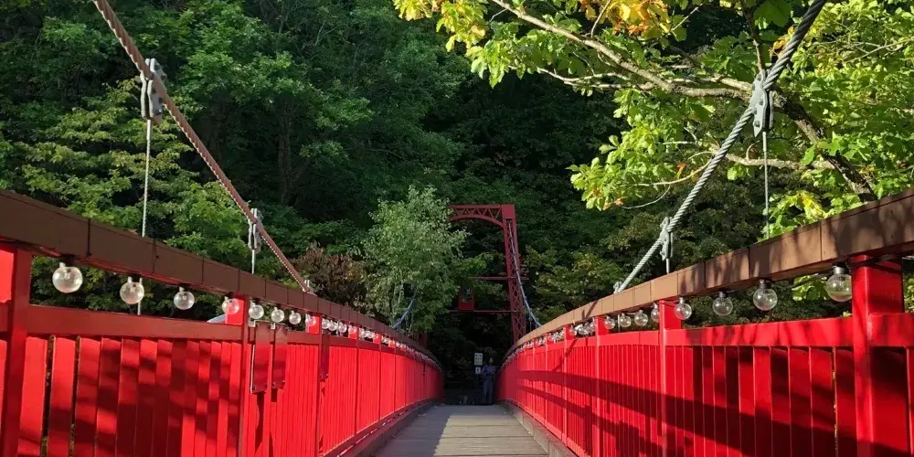 公園不大,沿著小溪走,不遠處的紅色二見弔橋赫然醒目。此外,你還會發現一些小河童的雕塑,十分有趣。公園中四處可見的流浪貓也是一個亮點,如果你是愛貓人士,這裡說不定會比定山溪的溫泉更吸引你哦。