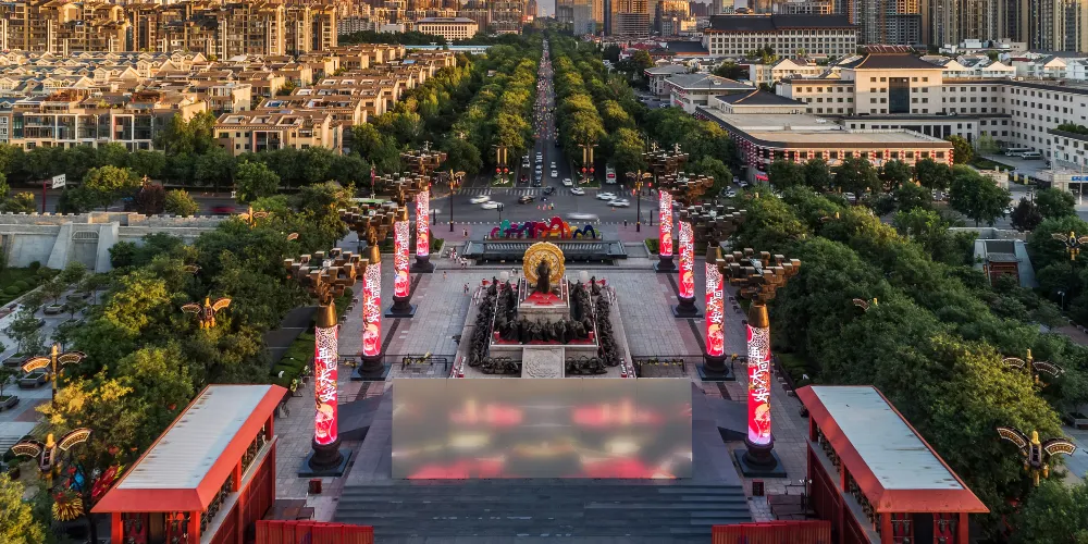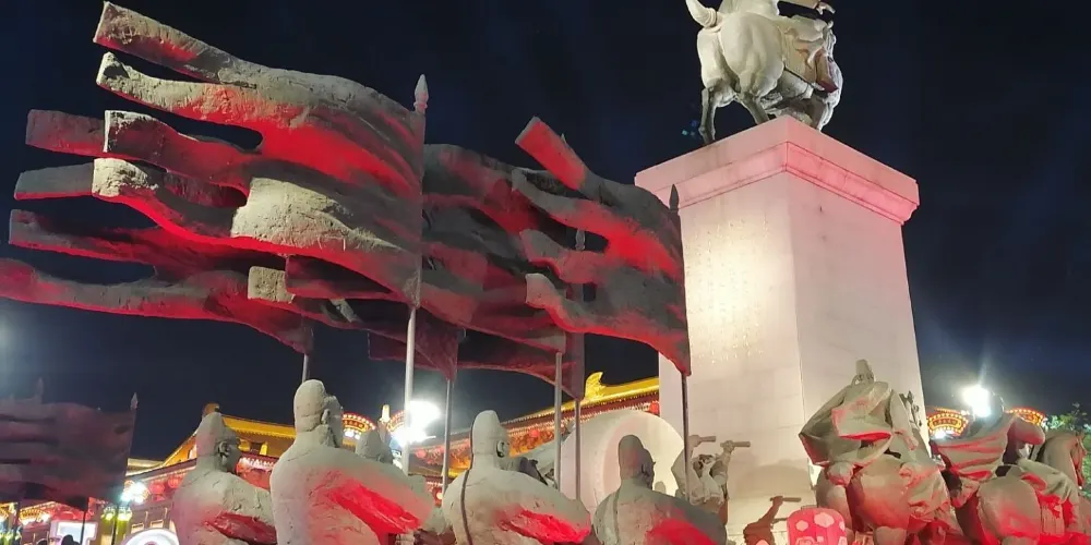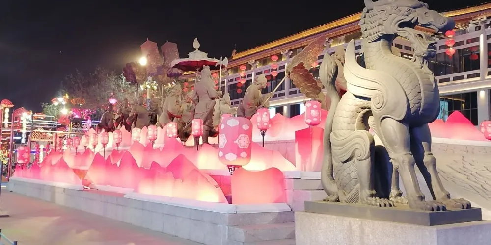 大唐不夜城的中軸景觀大道是一條約1500米橫貫南北的中央雕塑景觀步行街,其上分佈着盛世帝王、歷史人物、英雄故事等九組主題羣雕,立體展現大唐帝國在宗教、文學、藝術、科技等領域的地位並彰顯大國氣象。