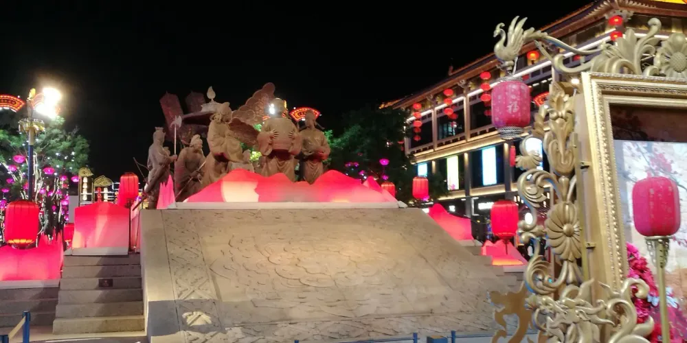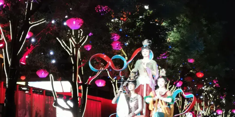 大唐不夜城以大雁塔為依託,北起玄奘廣場、南至唐城牆遺址公園、東起慈恩東路、西至慈恩西路,貫穿玄奘廣場、貞觀文化廣場、開元慶典廣場三個主題廣場,擁有六個仿唐街區和西安音樂廳、西安大劇院、曲江電影城、陝西藝術家展廊四大文化建築。大唐不夜城晚上燈火璀璨,光影中的仿古建築流光溢彩,氣勢恢宏,宛如大唐盛世再現。