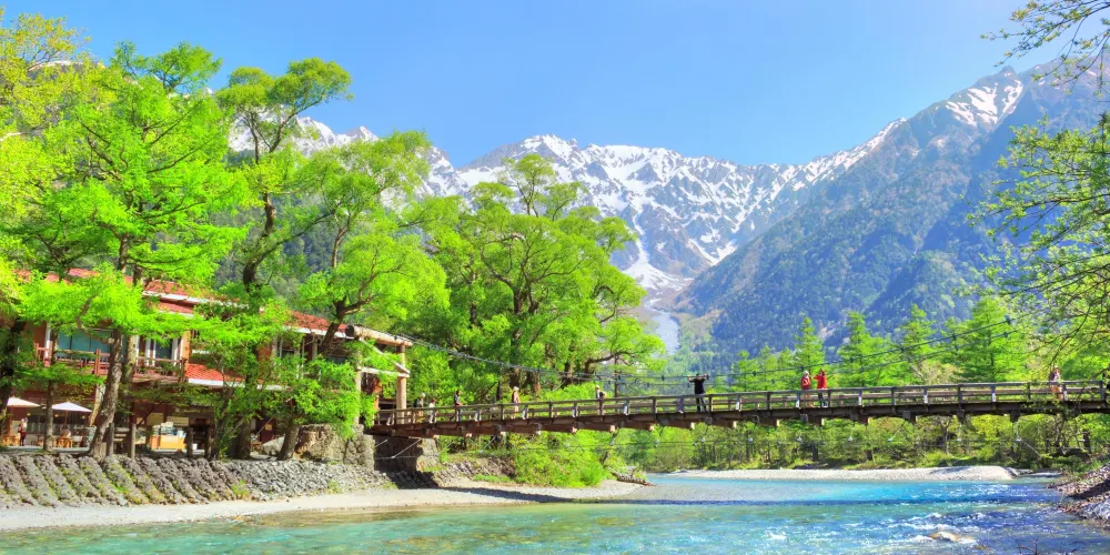 上高地的象徵——河童橋是一座木製弔橋,從橋上朝上遊望去,並排聳立著西穗高嶽、奧穗高嶽、前穗高嶽、明神嶽等海拔3001米級別的山峰。朝下遊望去,則可以看到正在噴煙的燒嶽。而穿流於鑽天柳、落葉松林間的梓川風景也很優美,是絕好的眺望台。