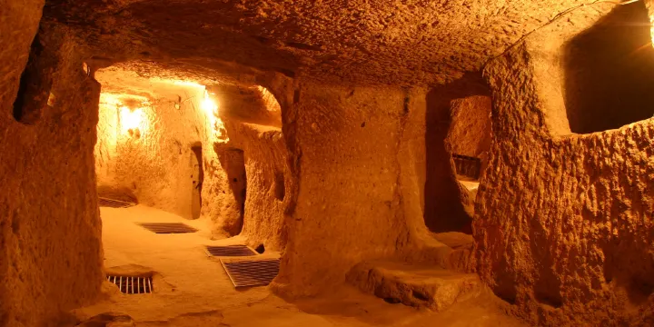 走進地下城,就彷彿進入了一個複雜多孔的巨型瑞士乾酪,到處都是洞,房間之間有很多的“窗戶”,小路繞來繞去,上上下下的路有好幾層。地下城設施的齊全,到處是人們穴居生活的痕迹,儲存油、酒和水的罐子,擠壓葡萄的水槽,油煙熏黑的公共廚房,牛棚馬圈和深的不可思議的井,除了臥室之外甚至還有學校和教堂。