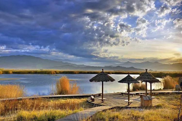 可可蘇裡湖座落於新疆阿勒泰地區富蘊縣境內,距縣城約25KM,又稱野鴨湖。它是由地震斷陷形成的湖泊,湖面面積約1.8平方公裡,平均水深2米,湖中有大小浮島20多個,水生植物豐富。最為奇特的是,水中的蘆葦是直接長在水上沒有根的,隨風漂遊,可謂是風一場景一場。湖面景色隨蘆葦的變動而變化。每年夏秋季節,成千上萬的野鴨、紅雁雲集在此繁衍生息,野鴨們成雙成對覓食戲水,自始自終雙雙結伴,一旦一隻離去,另一隻便終生不再“嫁娶”,常常是獨自一個在湖的上空徘徊低飛,情景淒慘,令人動容。“