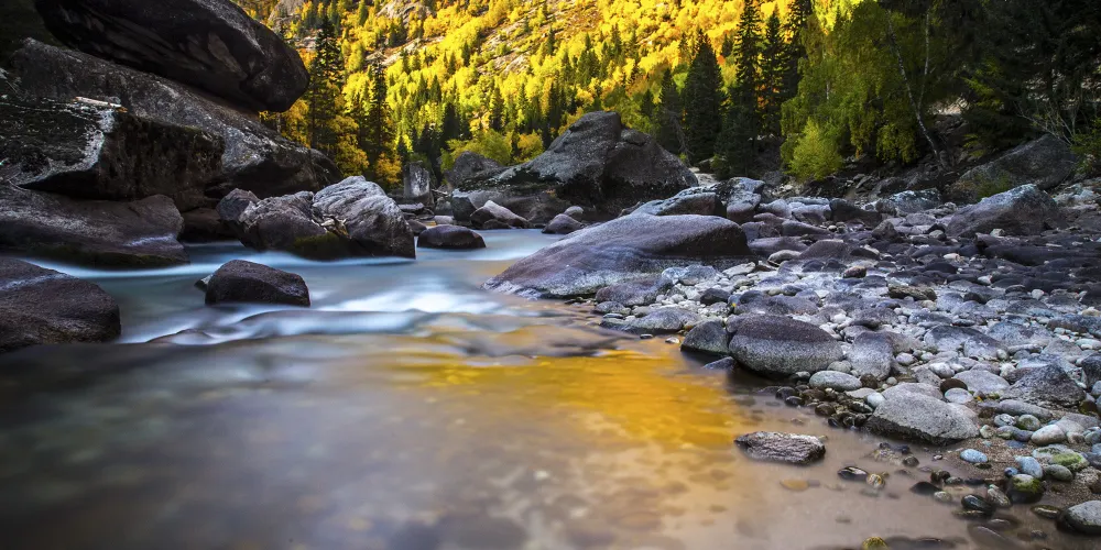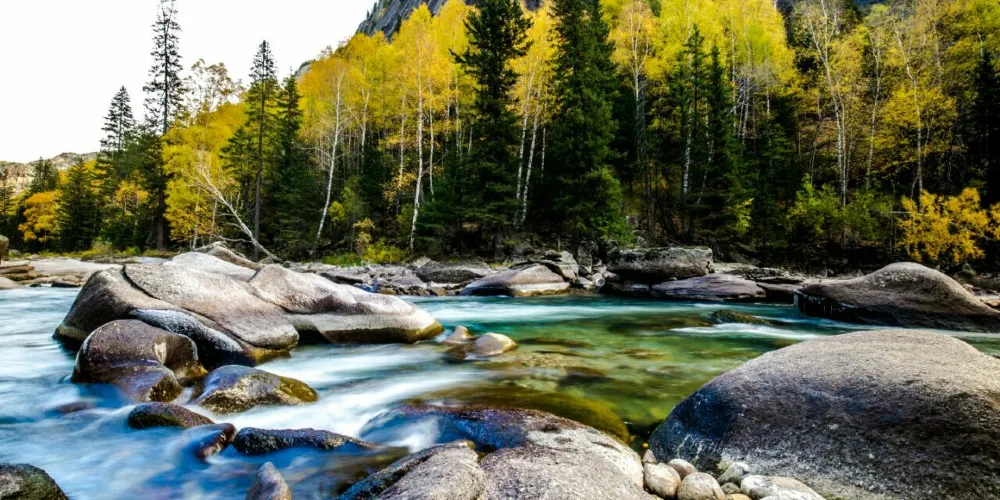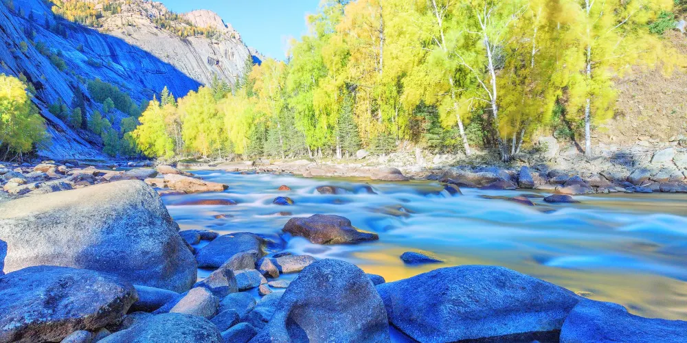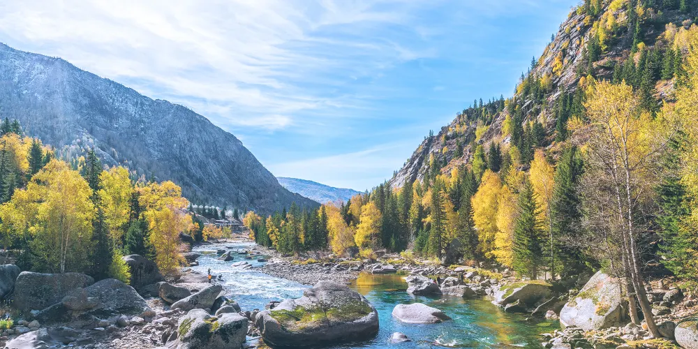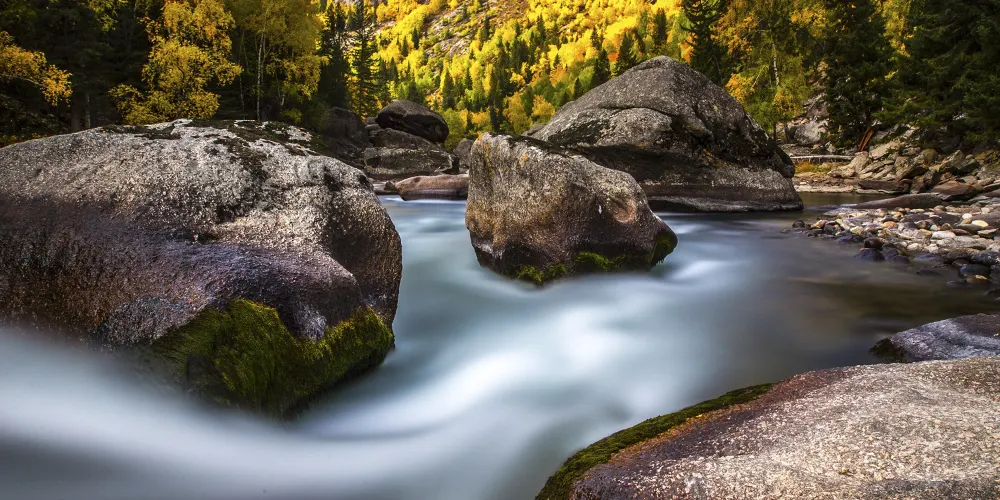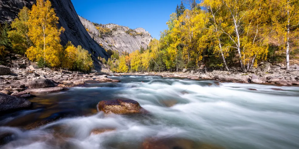 可可託海景區位於北疆阿勒泰地區的富藴縣東北側,是一般遊客遊玩北疆喀納斯環線路上會前往的重要景點。景區裡有幽深的峽谷、清澈透明的河流、陡峭秀麗的山峰,環境非常優美。在峽谷之間還有大面積的樺樹、楊樹和松樹林,適合秋天前來,此時樹葉金黃絢爛,而森林背後的山頂此時也開始積雪好像漂亮的雪山,山林河水相映,是秋色攝影的不錯之選。