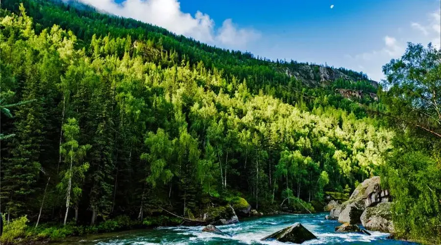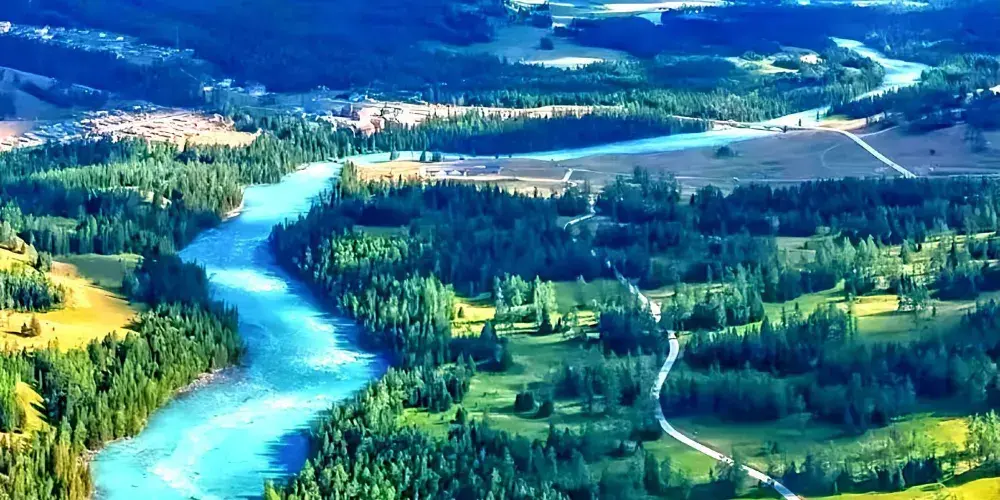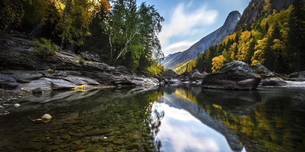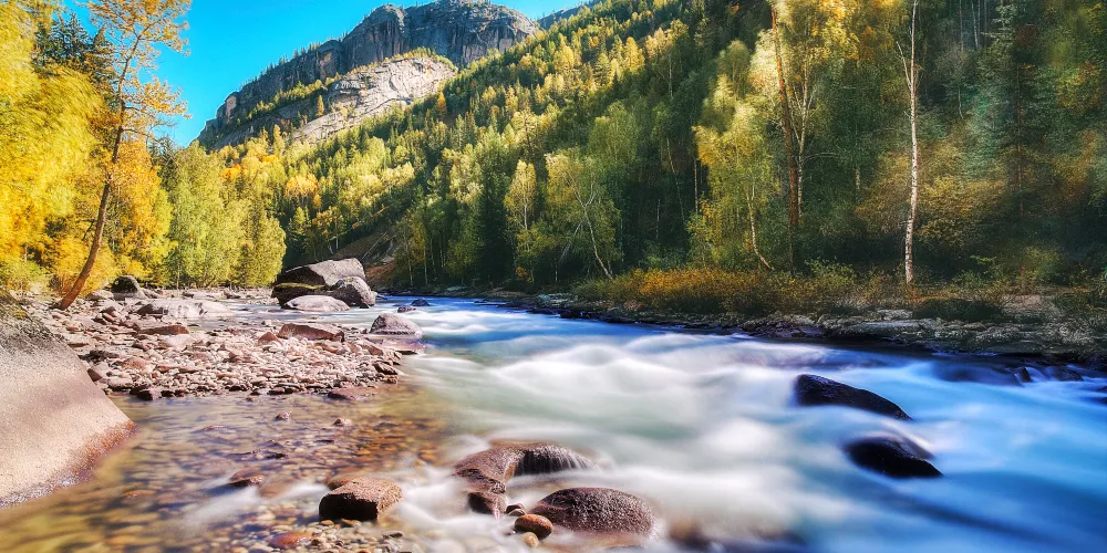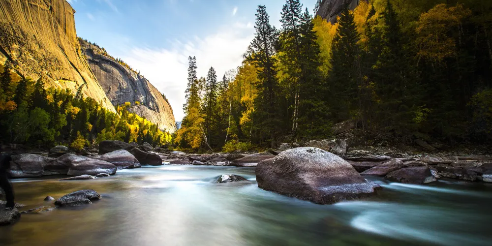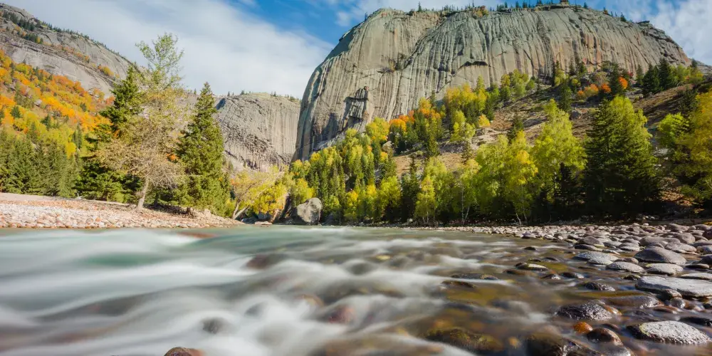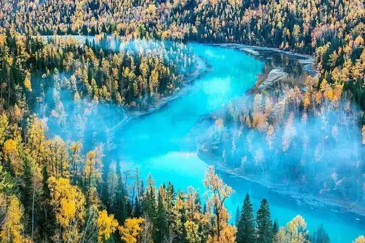 可可託海景區位於北疆阿勒泰地區的富藴縣東北側,是一般遊客遊玩北疆喀納斯環線路上會前往的重要景點。景區裡有幽深的峽谷、清澈透明的河流、陡峭秀麗的山峰,環境非常優美。在峽谷之間還有大面積的樺樹、楊樹和松樹林,適合秋天前來,此時樹葉金黃絢爛,而森林背後的山頂此時也開始積雪好像漂亮的雪山,山林河水相映,是秋色攝影的不錯之選。