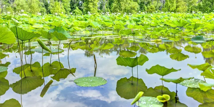 荷花從淤泥中升起,各種種類的荷花坐在水面上。風與蜻蜓共舞,在樹叢中沙沙作響,抬起鳥兒的歌聲,直到它掠過您的臉龐,漸漸低語,説“來吧”。