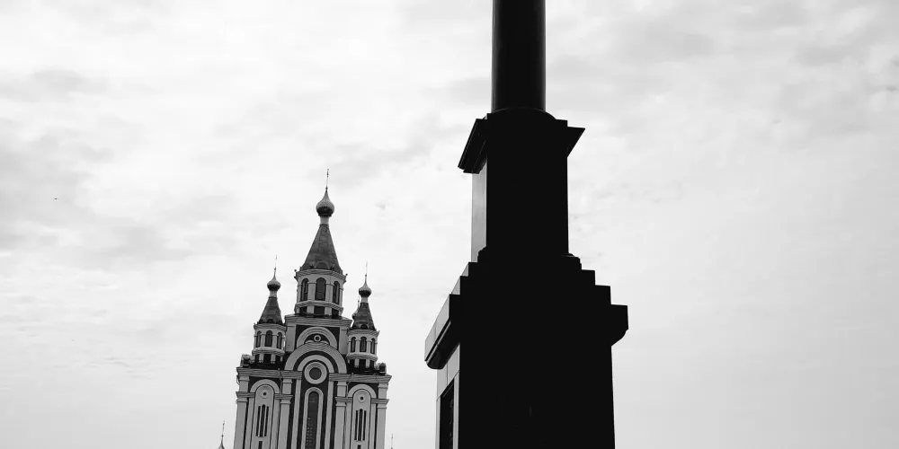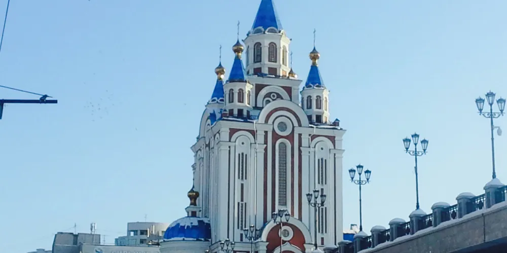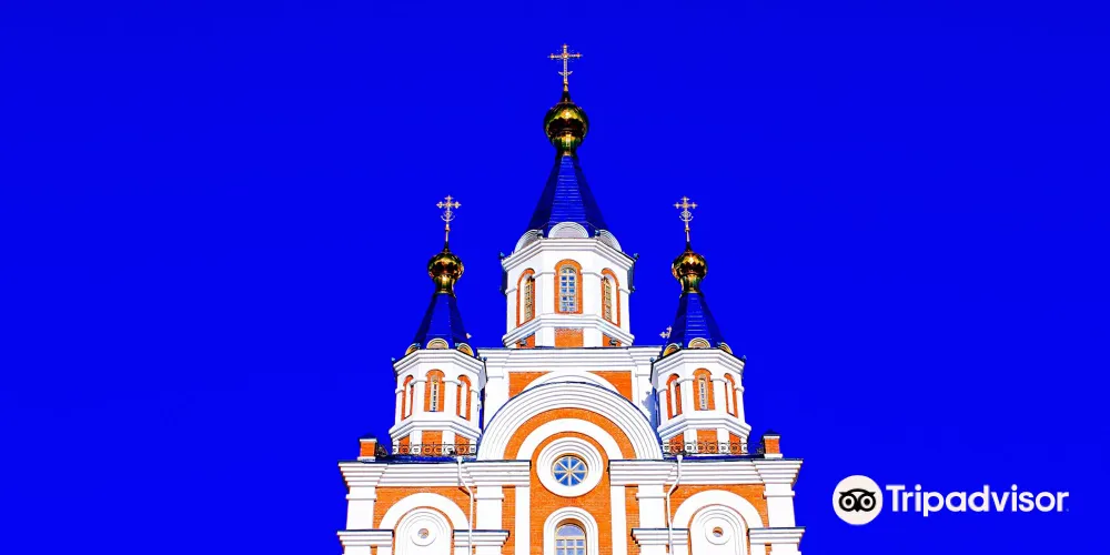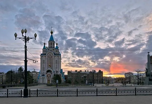 Grado-KhabarovskCathedraloftheAssumptionoftheMotherofGod是一棟藍色尖頂大教堂,外觀十分醒目。