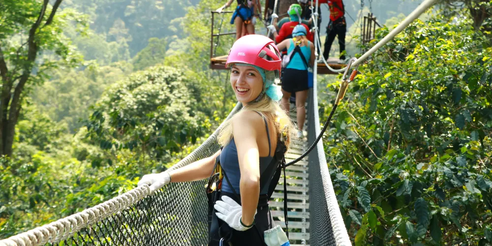 金剛微笑滑索(Kingkong Smile Zipline)位於泰國清邁的Meatonluang村山頂,是亞洲最長、最高的滑索項目。遊客可以在這裡體驗驚險刺激的雙纜滑索,飛躍山脈和美麗的叢林山谷。項目提供基礎版和尊享版兩種套餐,基礎版包含19項滑行項目,尊享版則包含38項滑行項目。此外,遊客還可以享受泰式自助餐和酒店接送服務。