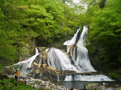 經霧降川,上下2段瀑布。撞擊到石的水如霧般飛散飄舞,因此得名。
