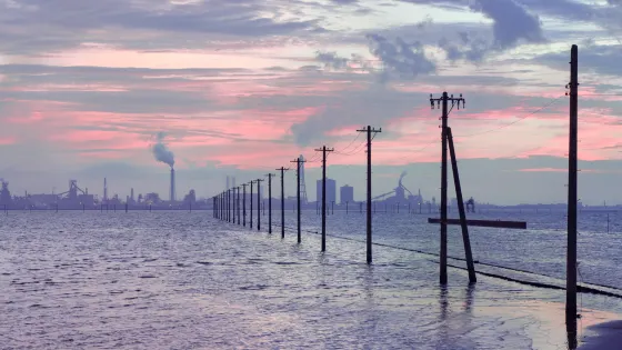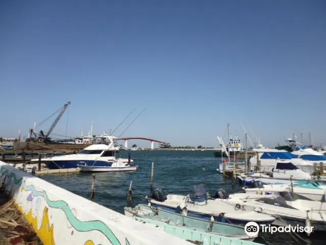 一根根電線桿矗立在海上,十分壯觀。這裏海水清澈蔚藍,日落之時海天相接,是一道靚麗的風景線。