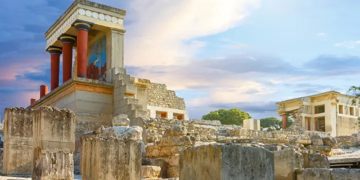 這座王宮曾是克里特島上較豪華、規模較大的宮殿。現被認為是傳説中的米諾斯迷宮,是米諾斯文明的重要標誌和中心。在克里特島上總共有4個米諾王宮,而克諾索斯宮是其中較大的一個,由巨大的宮室、花園、浴室等部分組成,如今,遺址牆壁上還殘留部分壁畫,是來到克里特島不可錯過的精美畫卷。