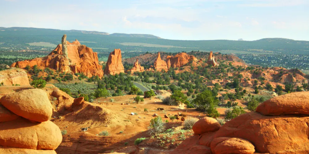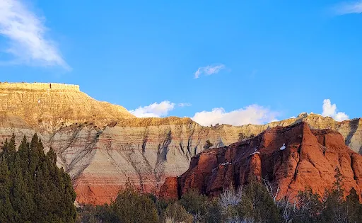 柯達盆地國家公園是一座以石頭出名的猶他州州立公園。這裏的地貌非常特殊,公園內都是一根根顏色各異的煙囱石,因其外形酷似煙囱而得名。路邊還經常會出現大叢的黃色野花,給這片荒蕪的土地增添了一份生機。日落和日出是公園很美的時間,金黃的陽光灑在紅色的大地上,令人沉醉。