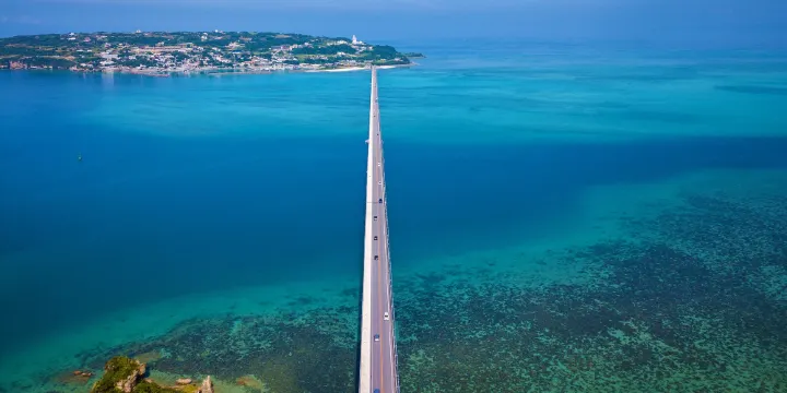古宇利大橋跨越美麗湛藍的海洋,連接著屋我地島及擁有沖繩版亞當與夏娃神話傳說的古宇利島。沖繩的海被稱作是“七色海”,開車從古宇利大橋上經過時,兩邊的海水像翡翠一樣。海面的顏色湛藍湛藍,深淺不一,但又清澈見底,是十分美麗的景色。