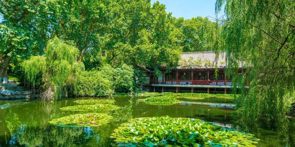 快哉亭公園面積寬廣,林木茂盛,園內有亭樓、逍遙堂等仿古建築,也有涼亭、水榭、曲橋、荷塘等景點,景色優美。