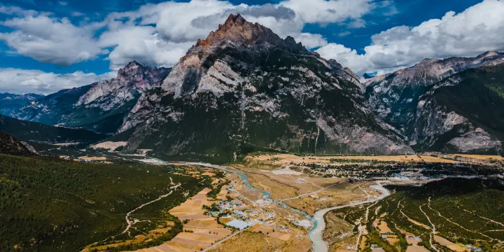 盔甲山原名阿里措日,也叫"松多巴熱神山"和"念波茶熱神山"。相傳它們是一對夫妻,而周圍的其它雪山均是它們的子女。盔甲山接近山頂部分全由石板巖層構成,經線長而分明,經風化形成很長的台階若干層,每年4-5月,積雪在石板崖上化掉一部分後,遠遠望去,呈現出與古代兵勇所披盔甲上的花紋,所以叫盔甲山。
