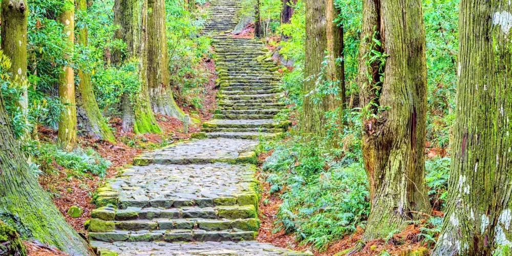 熊野古道是古時由京都往熊野三山(熊野本宮大社、速玉大社、那智大社)的參拜道,沿途仍留有昔日風情,參拜者至今絡繹不絕。通往熊野本宮大社的大門阪位於鬱鬱葱葱的杉樹叢中,大門阪是熊野古道中人氣較高的地方,參天巨木夾道顯得莊嚴,長滿青苔的石階為當年鋪設之物,人們可以輕鬆品味漫步青苔石階道這一原汁原味的景象。
