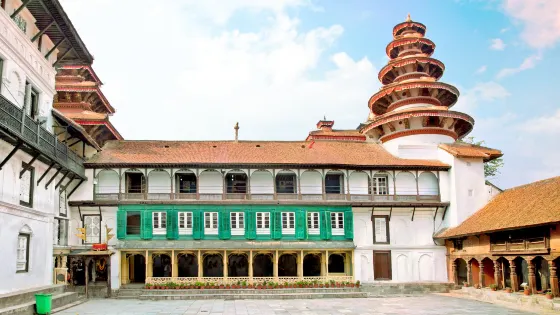 杜巴廣場的東側是舊皇宮-哈努曼多卡宮,是一座新古典主義風格的白色建築。在大門口可以看到一座猴神哈努曼雕像,進門後即可參觀部分宮院。