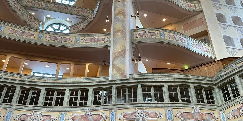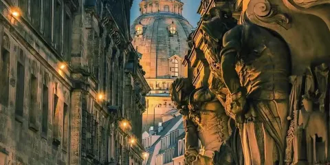德累斯頓聖母大教堂始建於1726年,採用了圓形拱頂、砂岩拼建等前所未有的建築方式,是由木匠大師奧爾格·貝爾主持設計修建的,曆時17年方才建成。聖母大教堂高95米,規模巨大,精巧華麗,是西方新式教堂建築的代表作,是這座古老城市的標誌性建築,也是德累斯頓最亮麗的風景,有許多音樂大師和藝術大師在這裡留下了他們的足跡。
