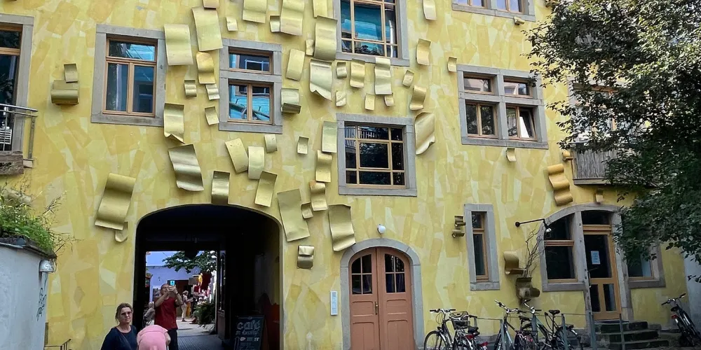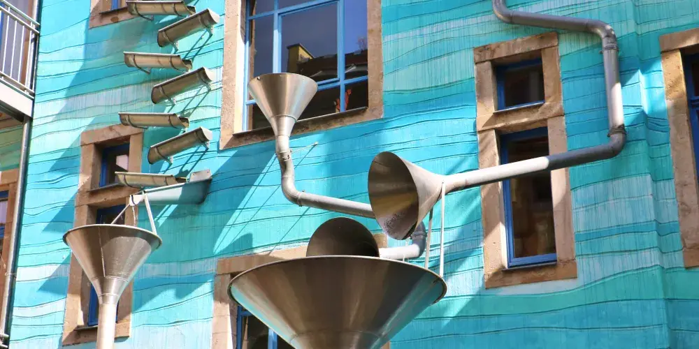 光雨庭其實是座圍牆,圍牆上佈滿瞭如交響樂團喇叭的排水管,彎彎曲曲、延伸在藍色的樓外。在安靜的情況下,豎起耳朵可以傾聽流水打在管子上的清脆聲響;有“光”則是因為在牆面上還佈滿了捲曲的金屬薄片,陽光耀眼時,各個小影子點綴在牆面上。