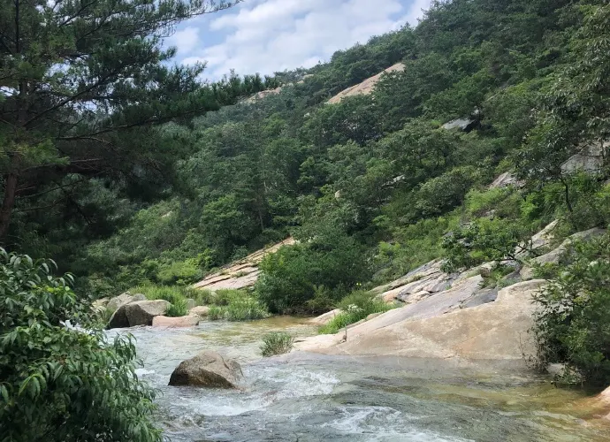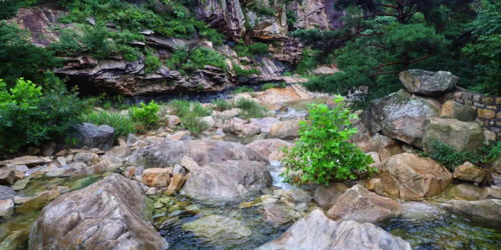 昆嵛山無染寺坐落於主峰泰礴頂南面的山腳,始建於東漢桓帝永康年間,為繁盛一時的膠東佛教古剎。據《寧海州志》記載,早在戰國時期曾建有一座廟宇,取名“無染院”。無染寺景區植被茂密,峰巒連綿,有震撼的萬米大峽谷,上下分佈著顏色各異的十八潭,溪水、瀑布、清泉連在一起,碧水流動,人稱"江北小九寨"。