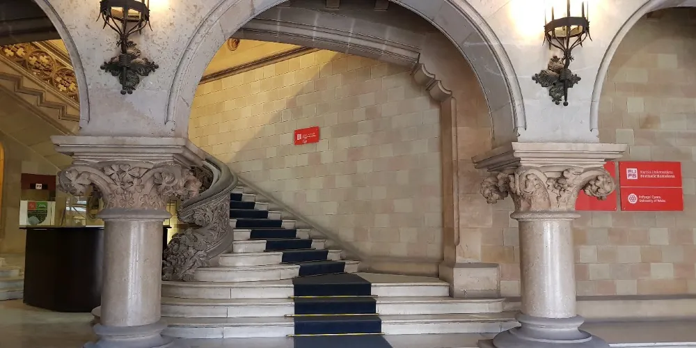 △ 大廳內部隨處可見的是充滿現代風味的工藝品。房間頂部是巨大的螺旋造型,像大海的漩渦一樣,漩渦中心是海葵樣的頂燈。一樓的大落地窗,可俯瞰格拉西亞大道。另一面還有一個陽台,陽台的門口有一個像人腿的立柱,通往一個現代主義風格的庭院,為各類大型活動提供了戶外空間。一樓的大落地窗,可俯瞰格拉西亞大道。