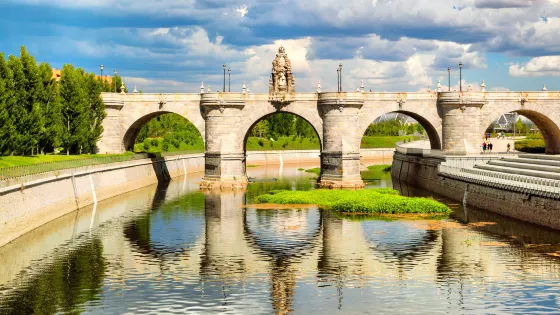 4.8 分39 則評價距離市中心 距離市中心2.1公里托萊多橋建於曼薩納雷斯河上,建於18世紀,由里貝拉設計。橋的正中間有聖伊西德羅和他的妻子聖瑪麗亞·德·拉卡貝薩的雕像。是許多遊客喜歡合照的地方。關於聖伊西德羅,在西班牙幾乎無人不曉,據說這位守護神1082年生於馬德里,一生留下許多傳奇經歷。相傳有一次聖伊西德羅正在修築一口水井,他的兒子不慎掉到井裡,聖伊西德羅有些無厘頭似地對著水井一番求情,沒想到井水竟然奇蹟般地漲到了井口,他的兒子也隨之脫險。