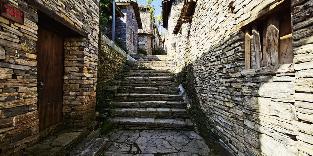 拉豪營盤石板寨就在南長城景點附近,歷史上曾經是南長城軍事體系中的一個軍營,有其獨特的建築風貌。由於湘西一帶多是沉積巖,苗家人就地取材,村寨的街道和房子都用巖石塊堆砌而成,因此稱之為石板寨。昔日的營盤,已變成苗漢錯居的村寨,而居住的村民多位當年駐紮在這裏的軍人後裔,一個200多號人的村子卻有50多個姓。沿着一小而古老的石板台階往上走,台階陡峭,都是一片一片不規則的石板砌成,台階兩旁則是寨民居住的石板房,房屋的牆是用石板砌成的,連房屋的屋頂也是石板鋪成的,房屋周圍的籬笆更是用石板堆壘成的……眼之所見都是灰黑灰黑的石板、石頭、石房、石籬笆、石欄桿……看上去簡直就是一個原始的石頭部落,一個有規則的灰黑的石板世界。石板路、石板院牆、石板屋、石板豬牛圈、石板桌凳、石板長城,石板在這裏不僅僅是石板,它承載着人們的生活,承載着一種文化,承載着一段厚重的歷史。每塊石板厚的有20公分,薄的4、5公分,大小不等,上下兩面都比較平整。在砌築的時候,不用水泥砂漿之類的東西,一層一層地往上壘砌,趕盤壓縫,中間空隙用小石片填充。這裏的石板不易風化,如果不是人為破壞,每座建築物都可以保存上百年。