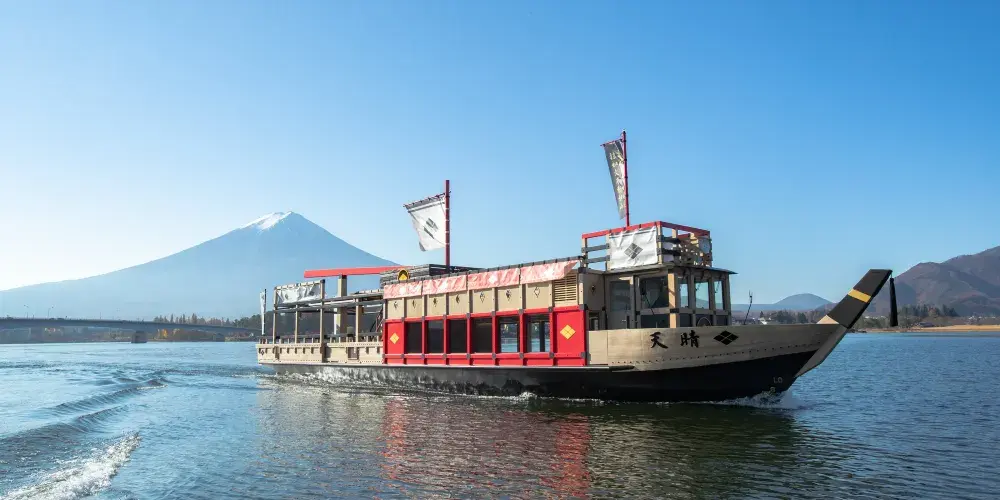 河口湖遊覽船 天晴的名字取自法語,意為「陽光燦爛」。遊覽船總共分為三部分,一層是船內客室,配有沙發和椅子,可以在此盡情放鬆;天氣晴朗時推薦到二層的客席,可以360度欣賞富士山的壯麗景觀。船內配置周全,使用輪椅的遊客也可輕鬆登船。遊覽船繞河口湖一周需20分鐘。如果天氣好的話,可以同時欣賞到富士山倒影成雙的如畫美景,這也被當地人認為是吉祥的徵兆。