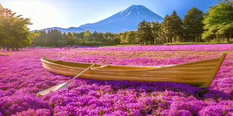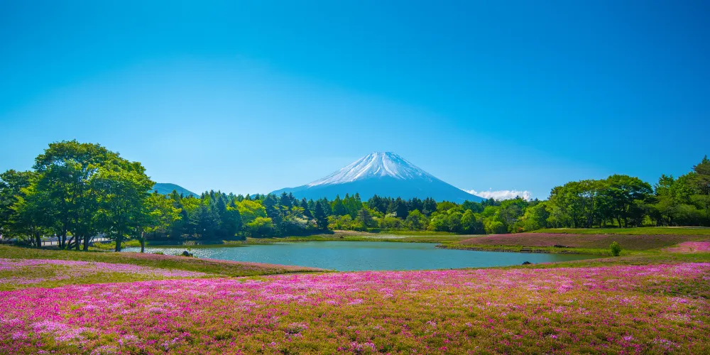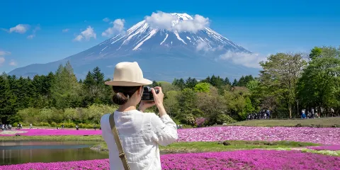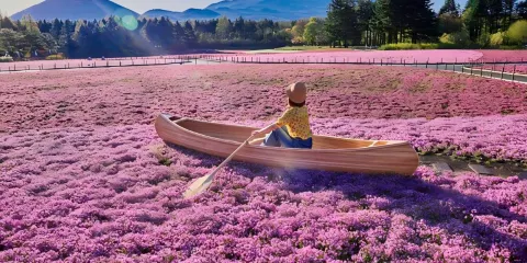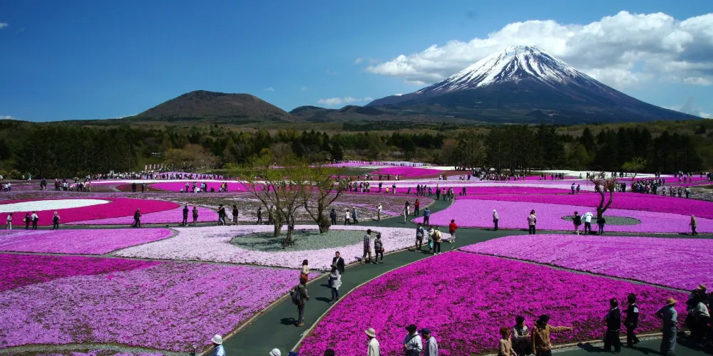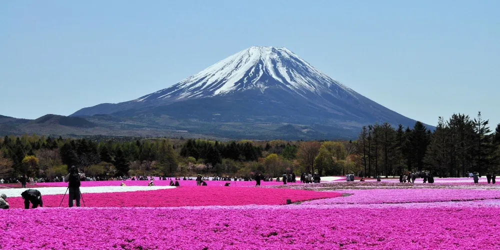 每年短短數週,富士山周圍的田野會變成一片粉紅色、白色和紫色的神奇地毯,作為背景的富士山山頂則白雪皚皚。景觀的鮮明對比令人眼界大開。