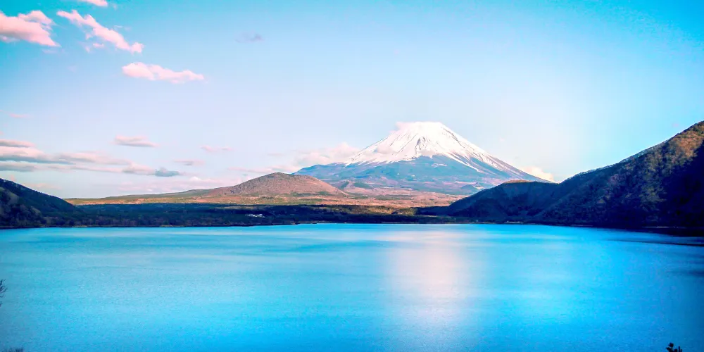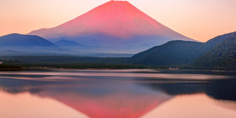 在由夏入秋時節的清晨,富士山看起來帶著絢麗的紅色,被稱為“紅富士”,而最能看到“紅富士”之美的地方當屬精進湖,據說是因為精進湖和其他地方不同,街道和住宅的燈光比較少,所以才能觀賞到紅彤彤的美麗富士山。