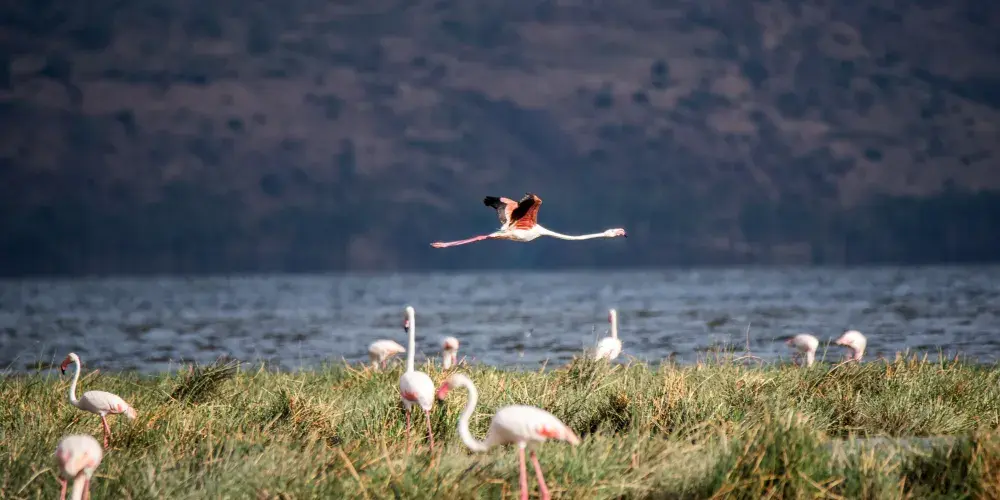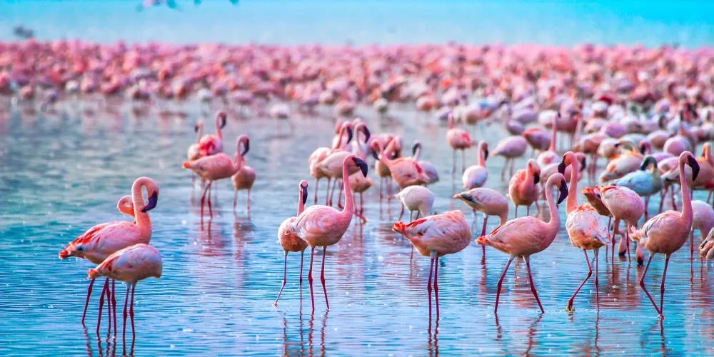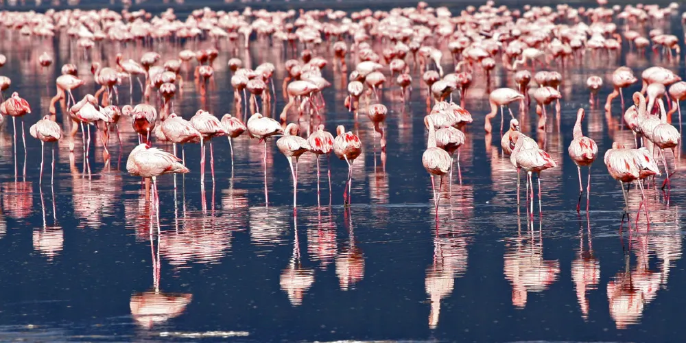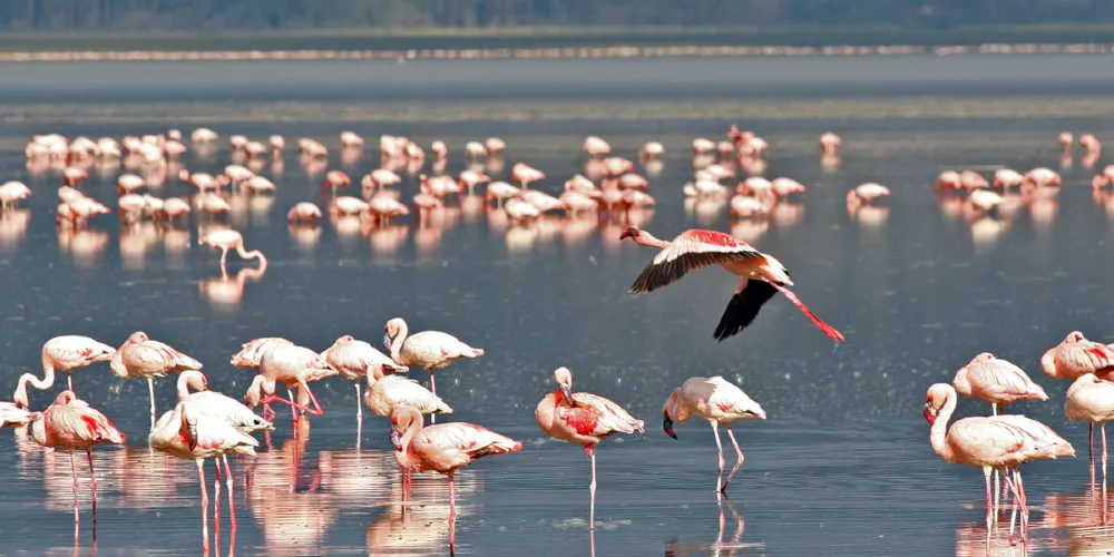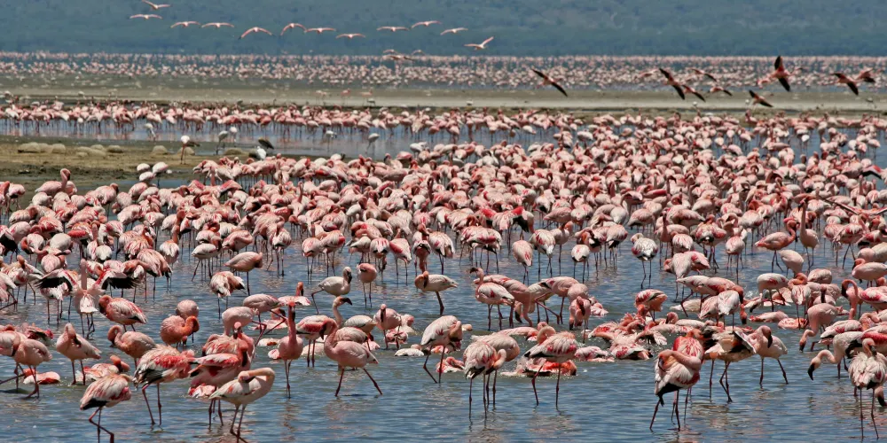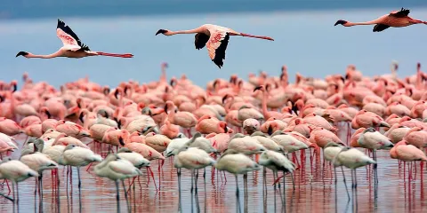 納庫魯湖國家公園是為保護禽類鳥建立的公園,被譽為“觀鳥天堂”。火烈鳥又名大紅顴,體型勻稱,羽毛有黑、白、玫瑰、硃紅色,喜歡結群,時常聚集萬隻以上,遠遠眺望,似錦如霞,豔麗異常,群飛群止,場面壯觀。