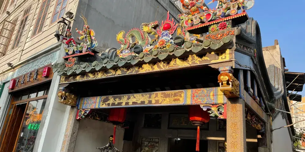 老媽宮位於外馬路頭,又稱天后宮,是汕頭設立外貿口岸前的建築。老媽宮建於清朝嘉慶年間,1992年重修開放。廟內門壁的石質浮雕和樑柱上的木雕彩繪具有很高的審美價值。特別是一對由整塊石頭雕刻的透雕盤龍柱石,雕有八仙立像,一般都是在皇宮和孔廟裡才能見到。廟宇屋頂的嵌瓷藝術是潮汕地區特有的工藝,用燒製好的彩色陶瓷片拼制出各種圖案,既美觀又可以抵抗風雨侵蝕。