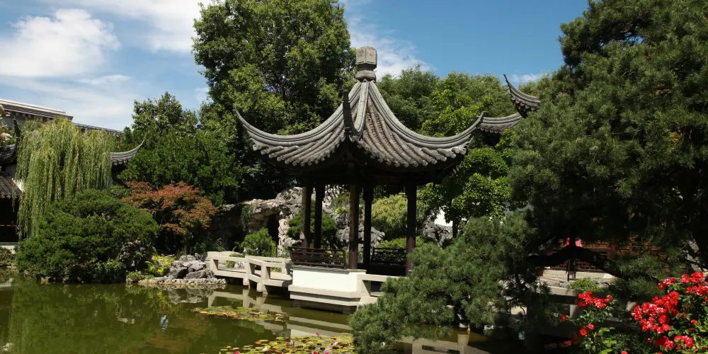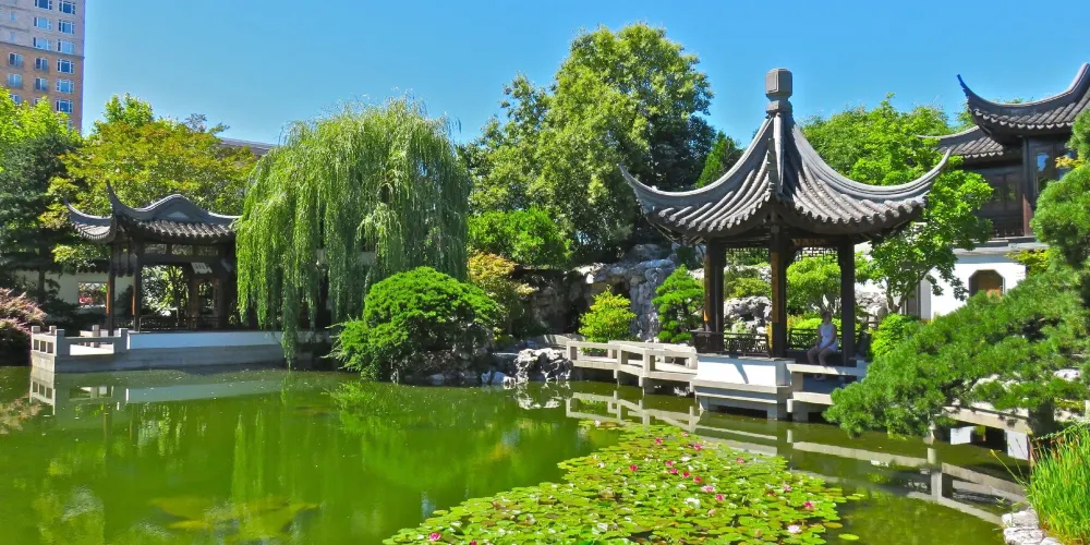 蘭蘇中國花園位于波特蘭市的唐人街,是一座典型的蘇州園林風格的花園。波特蘭和蘇州是姐妹城市,故這座花園得以建造。園子不大,佔地3700平方米,分為五個景區,中心湖區以水景為主。海外的中式園林中,蘭蘇園是較為精緻的一個。