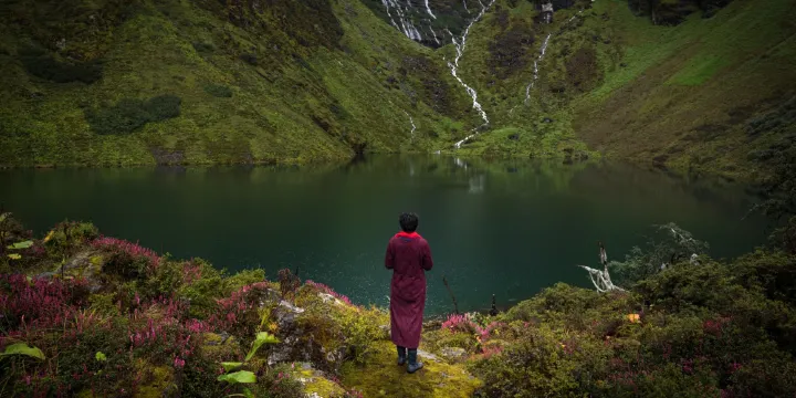 朗吉錯位於日喀則吉隆縣吉隆鎮扎村背後的拉多山的半山腰處,又名“朗青措姆傑姆湖”,是吉隆著名的神湖。朗吉錯被羣山所環抱,蔚藍色的湖水寧靜安謐,人跡罕至。站在湖邊凝神觀望,有緣人可以在倒影中看到蓮花生大師的容貌,十分神奇,遠近信徒也會特意至此轉湖朝拜。若環湖一週,會看到遠處的曲姆古拉和日吾班巴雪山倒映在湖中。