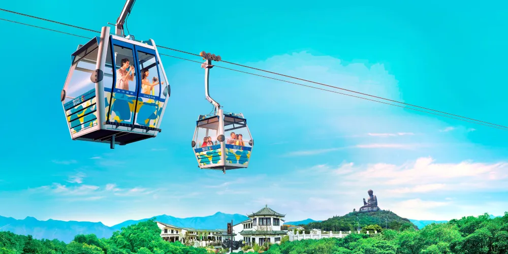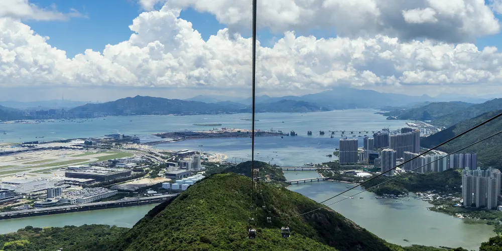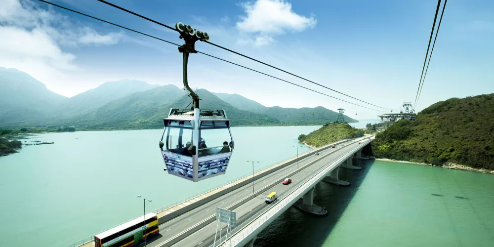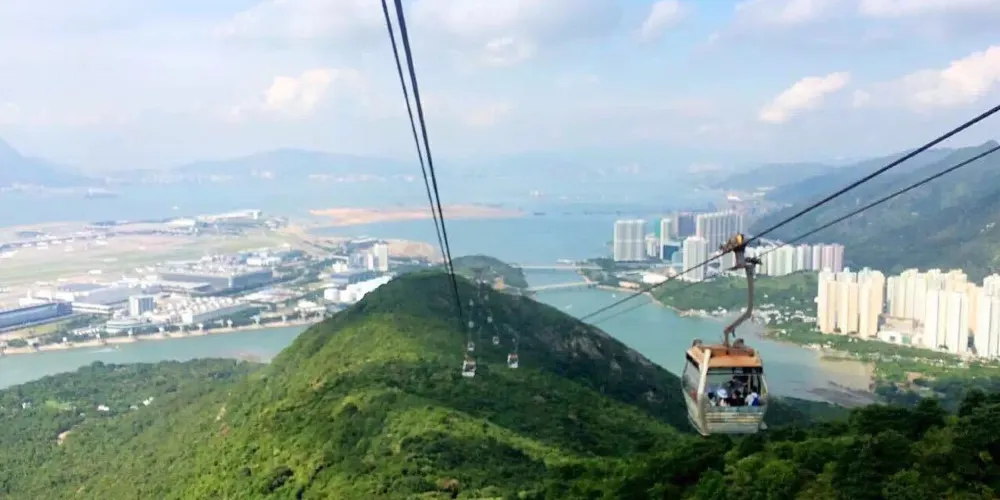 • 昂坪纜車的水晶車廂底下是透明的,讓你360度都能欣賞風景。 從纜車上可以遠眺身後的香港市景以及大嶼山的綠意山景