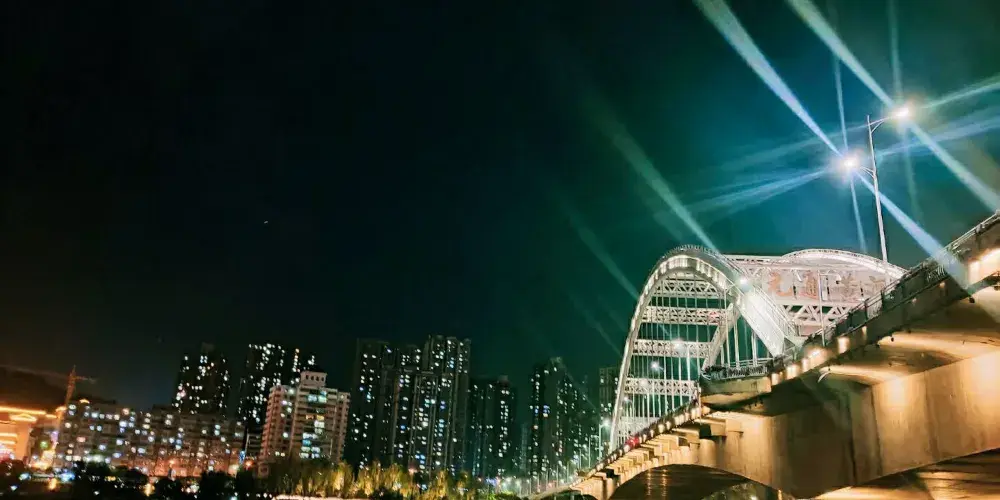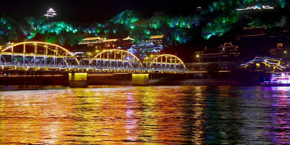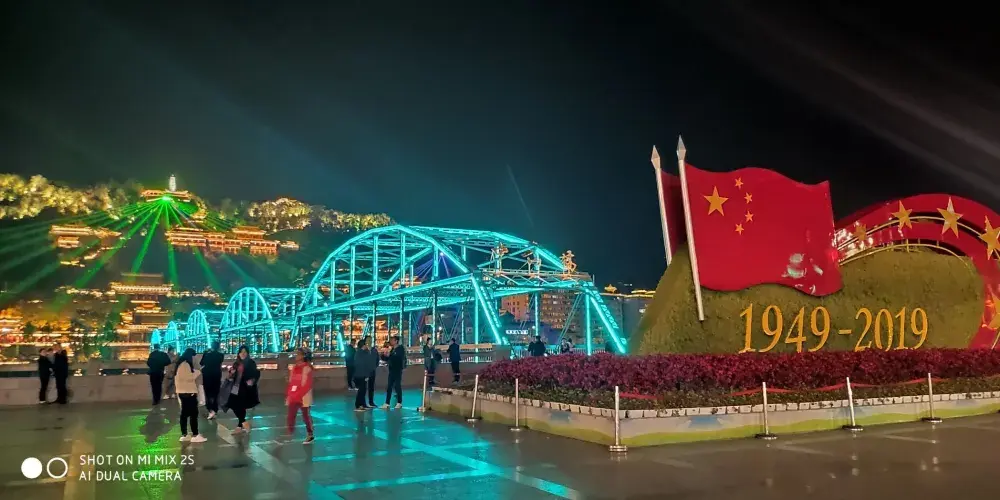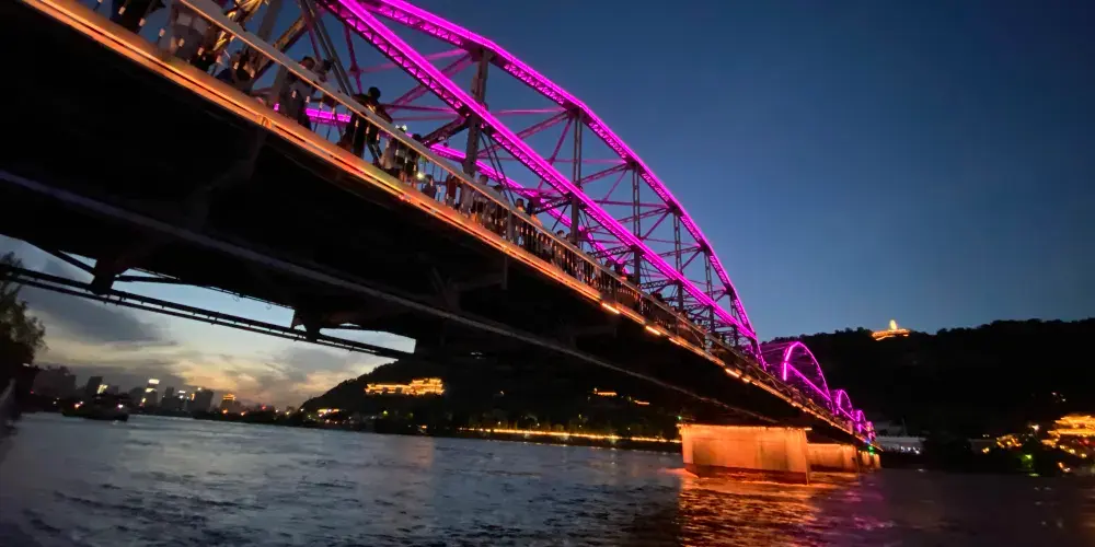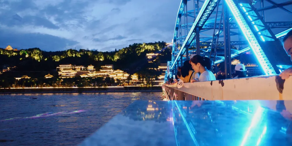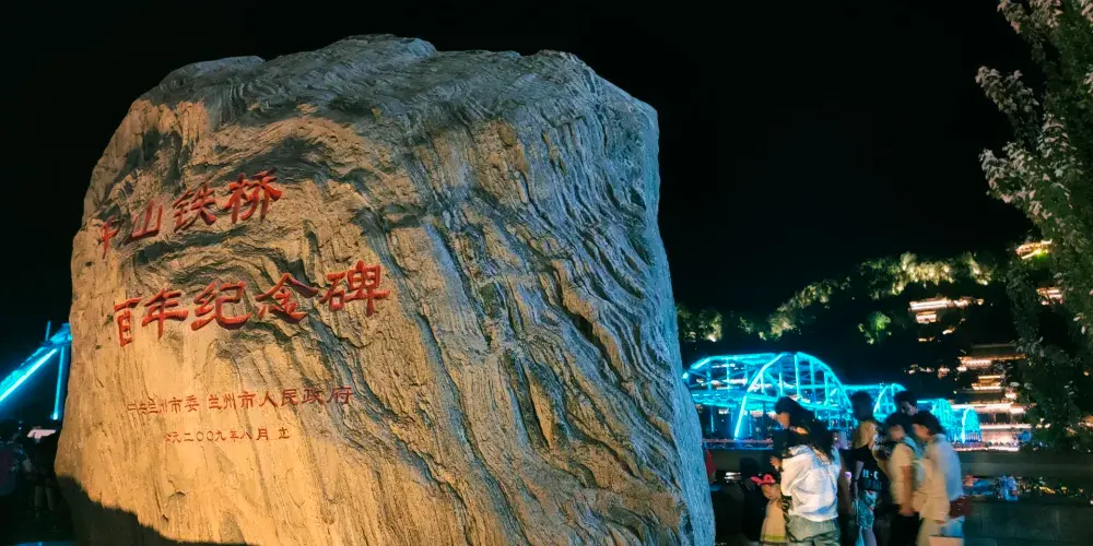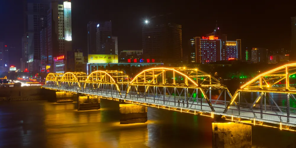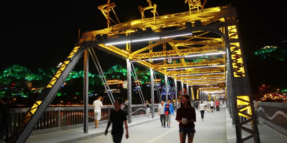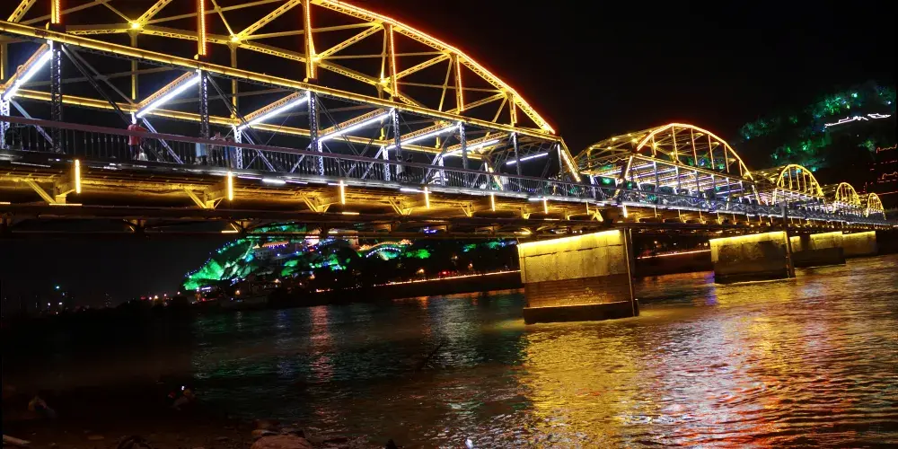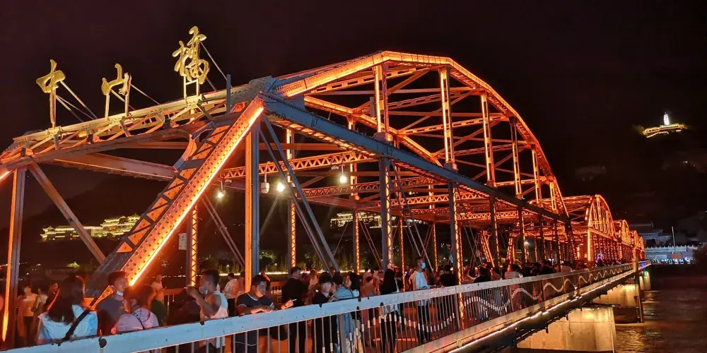 晚上時的鐵橋則是另外一番美景,此時遍佈橋身的彩燈都會亮起,整個鐵橋的輪廓明亮清晰。橋的一側是濱河路綠色長廊繁華街區的華燈,另一側山上的彩燈也全都亮起,非常漂亮,是拍攝蘭州夜景較好的地方。