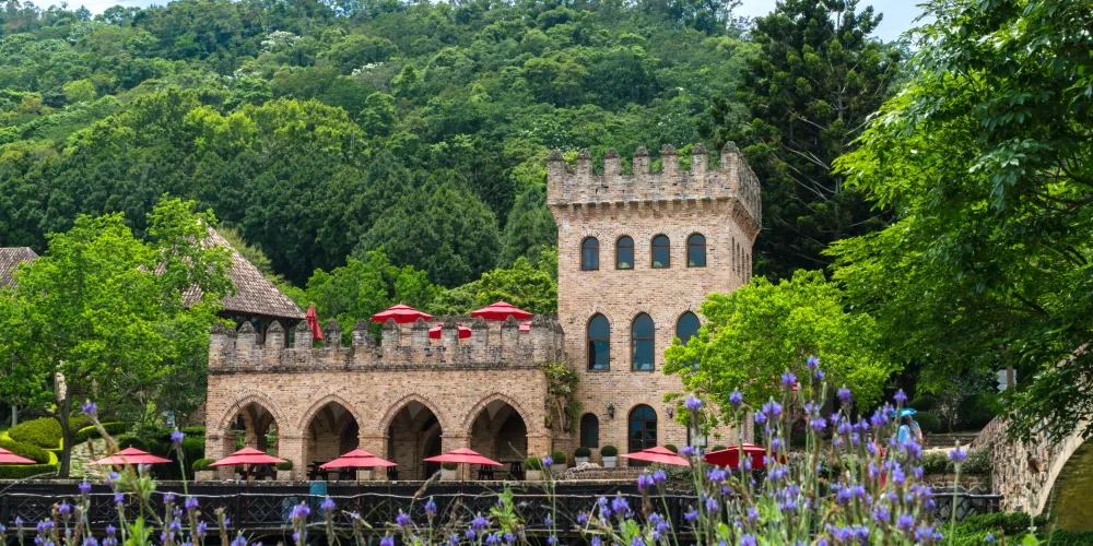 新社莊園又叫新社古堡,座落在台中大坑風景區內,為一處充滿綠意的莊園。置身其中,彷佛走進中古世紀的歐洲古堡,花園、酒莊、瀑布、六角餐廳┅┅每一處建築都是與大自然的巧妙結合,展現山中樸實的秀麗,漫步其中,就像是置身於仙境王國,十分愜意。