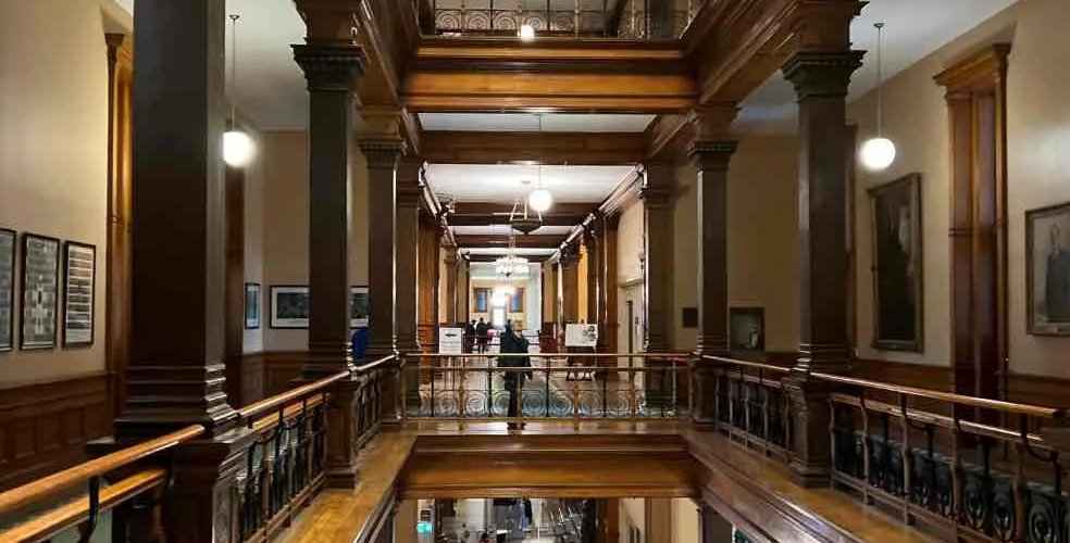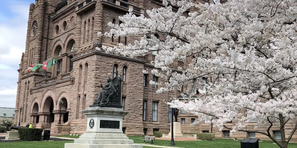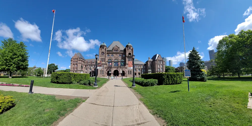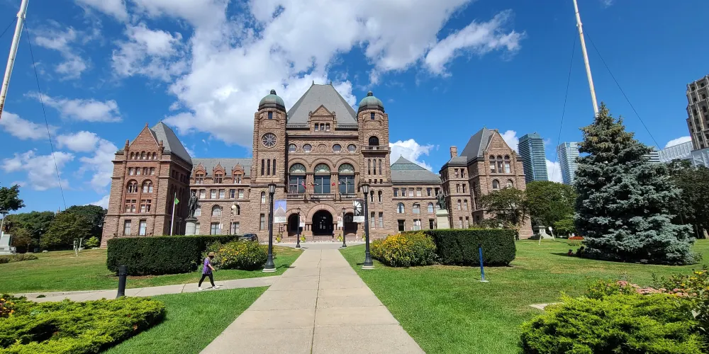 安大略省議會大樓位於多倫多市中心的皇后公園內,開闊的草坪間佇立著一棟宏偉復古的歐式建築,這裡是安大略省政府的辦公場所,你可以報名參加免費導覽團,參觀內部設施、觀看真實的開會場面。