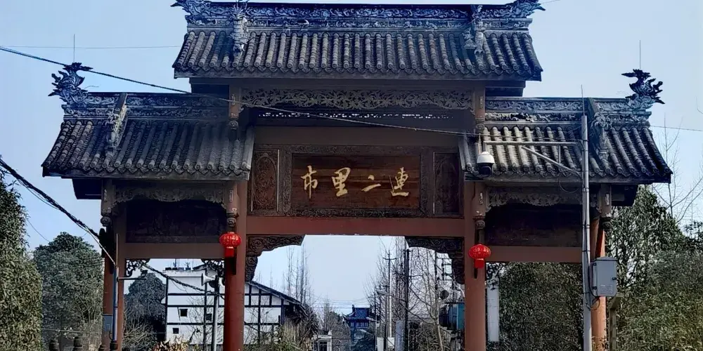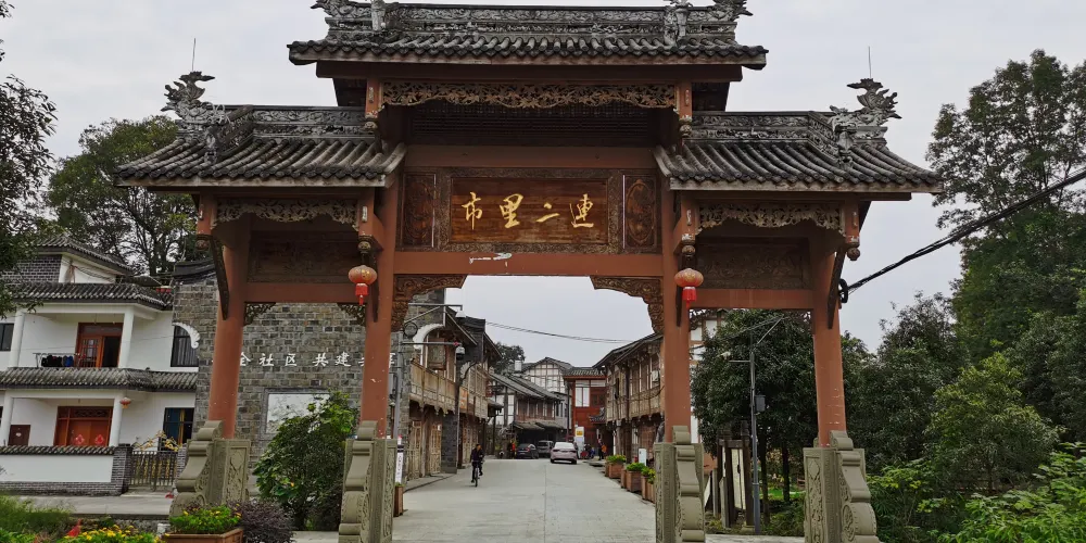 連二里市地處金馬河畔的温江區永盛鎮尚合社區的崇江老場,它與崇州市羊馬鎮伏虎村緊緊相連,是一個極具成都平原田園風光的鄉村橋場。連二里市是川西唯一集林盤、集市於一身的景區,至今仍保留着濃郁的農耕文化色彩。連二里市鄉土民俗氣息濃厚。崇江場雖小,但年節活動內容豐富多彩,每年幾乎月月都有節慶活動。農曆二月二十八有春台會,每逢會期,遠近鄉民扶老攜幼朝會訪友。當地人不僅愛朝會,更愛趕場。如今,崇江場公曆每月的“三、六、九”為趕場期,人如潮流,小街上人多貨雜,各種農副土特產擺滿街市兩旁。其中,尤以河邊小攤點銷售的各種小吃,如煎黃糕、餈粑等,因價廉物美,深受鄉民喜愛。