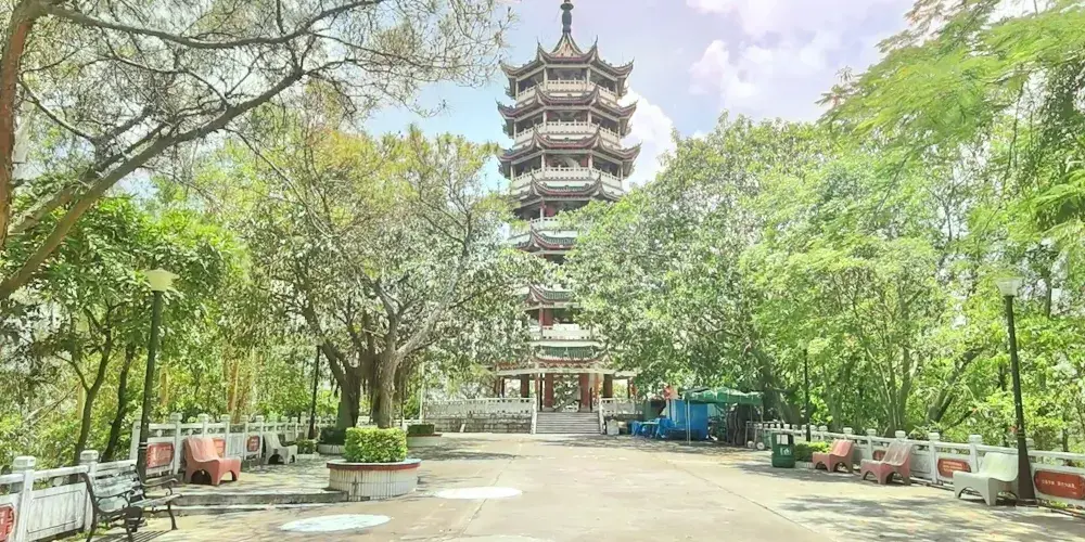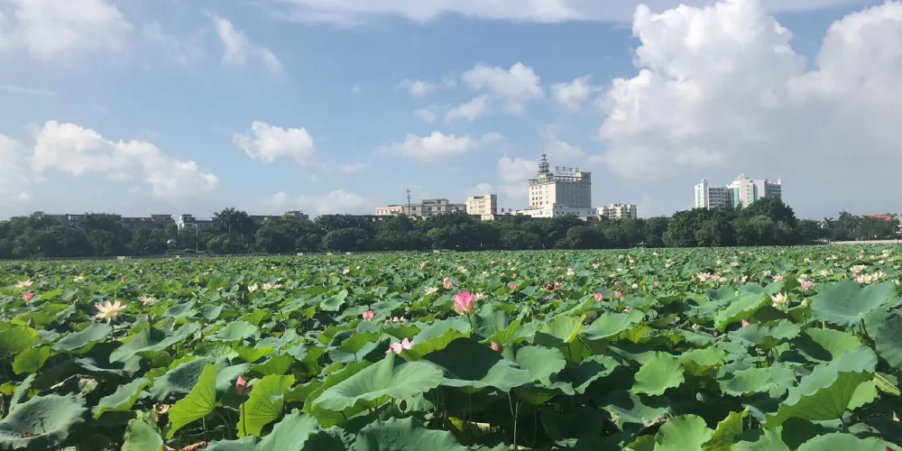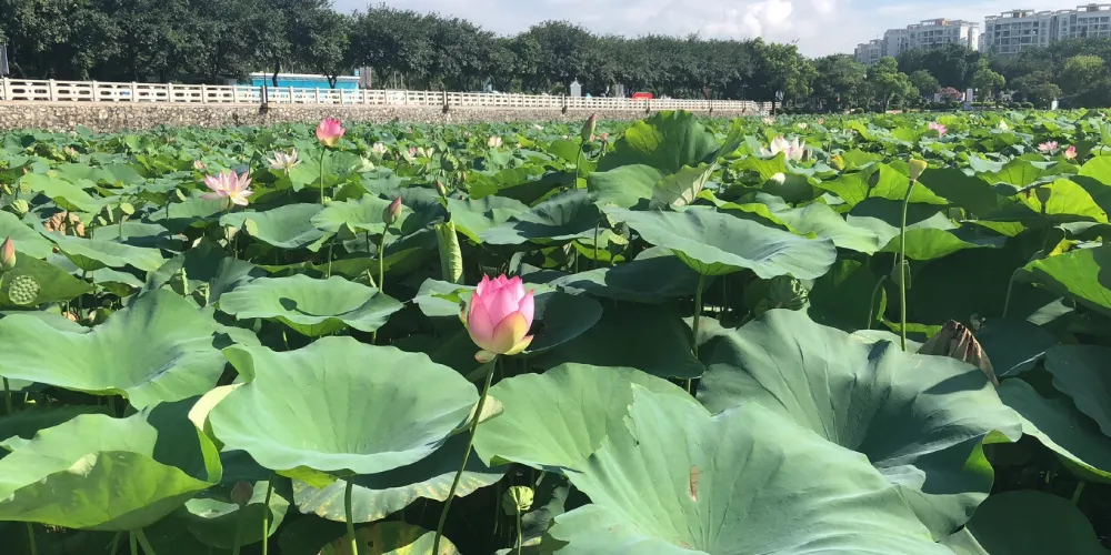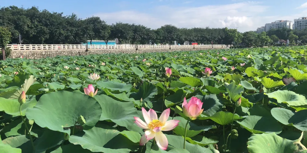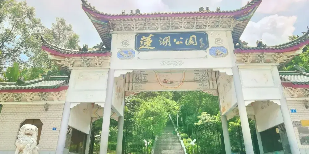 “蓮湖公園”之名,由書畫家關山月題寫,門牌樓兩邊是漢白玉浮雕“八駿圖”和“九龍壁”。書畫長廊沿山脊而建,展示著花鳥畫、山水畫等作品,唐詩書法龍飛鳳舞,整個長廊瀰漫著濃郁的文化氛圍。塔底周圍的扶欄全是漢白玉浮雕的花紋圖案,其精湛的工藝讓人嘆為觀止。公園的旖旎風景吸引了無數遊客前來觀賞,特別是每逢節假日,公園裡的遊人成千上萬,處處都是歡聲和笑語。