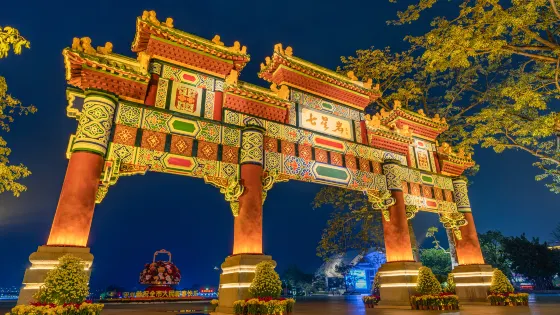 4.4 分400 則評價距離市中心 距離市中心934米七星岩牌坊廣場主要由七星岩牌坊、牌坊廣場、彩色音樂噴泉組成,它整體借鑒了嶺南建築及園林佈局的特色。其中有名的七星岩牌坊,為肇慶市的標誌性建築。它的色調以鮮豔的紅、綠、藍三色結合,呈現出肇慶市奔放熱情、充滿活力的生活態度。廣場的周圍建設有台階、花壇、磨菇形水簾亭等許多可供駐足的休憩場所。