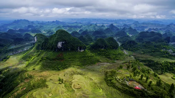 則評價萬山朝王因其山谷中羣峯突兀,百峯爭雄,佇立於此有如“君臨帥台,點兵閲將”而得名。此處擁有成片的喀斯特溶巖地貌,山形千姿百態,又有“第二丹霞”之譽。