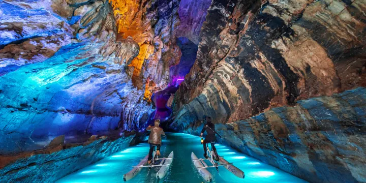 景區提供免費導遊講解,搭配導遊的講解再看石景會更為有趣。在走完陸地層後即可上船遊河,每船可坐10人左右。乘上小船沿暗河向前行進,河道彎曲曲折,時而開闊,時而狹窄,頭頂上的鐘乳石觸手可及。沿途會經過香蕉峽、蓮花峽、龍門峽三處峽谷,兩岸的鐘乳石景千姿百態,加上燈光的映襯,美輪美奐。人在洞中觀賞的時候,經常會被從穹頂落下的水滴打濕,不像那些開發過度的早已乾枯的溶洞,沒有一絲生氣。遊船時間約為40分鐘,整個溶洞的遊覽約為1個半小時。