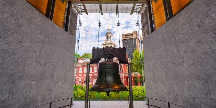 在費城獨立宮外的草坪西面矗立著一座小紀念館,知名的自由鐘就安放在其中。它是費城市的象徵,更是美國自由精神的象徵,也是美國人的驕傲。自由鐘在美國歷史佔有非常重要的地位。 自由鐘是到費城的必到景點,因此團隊遊的遊客較多,通常門口需要排上20-30分鐘的隊。自由鐘所安放的小紀念館四周門窗全是玻璃和鋼架構成,從外面看室內一目瞭然。 進入參觀前需要進行安檢,安檢非常嚴,類似於機場安檢一樣,一個個提包背包都要開啟,全體翻開檢查,然後再全身檢查。安檢過後便可進入參觀。 內部像一個小型的博物館,進入後可以看到一些有關自由鐘的曆史照片展覽,在其中一個展廳內有電視中文講解有關自由鐘的曆史意義,感興趣的話可以聽聽。看過展覽便可來到自由鐘面前,該鐘原放置在獨立宮建築的鐘樓上,後因鐘體開裂,被陳列於獨立大廳草坪外的紀念館中。 走近自由鐘可以明顯的看到鐘體上的裂縫,鐘面上刻著《聖經》上的名言:“向世界所有的人們宣告自由。在自由鐘的對面還有一個透明圓筒的捐款箱,裡面有世界各地的遊客捐獻的錢幣。