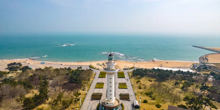 燈塔風景區是日照比較老牌的地標性景點,因岸邊高高聳立的航海燈塔而得名,這裡有廣場、有沙灘,視野開闊,景色優美。燈塔在廣場正中央,夜晚時,五台階水幕配合著音樂,整片景觀在夜晚燈光的映射下顯得流光溢彩、如影如幻。