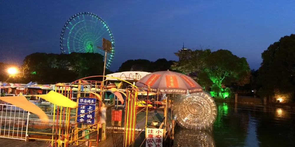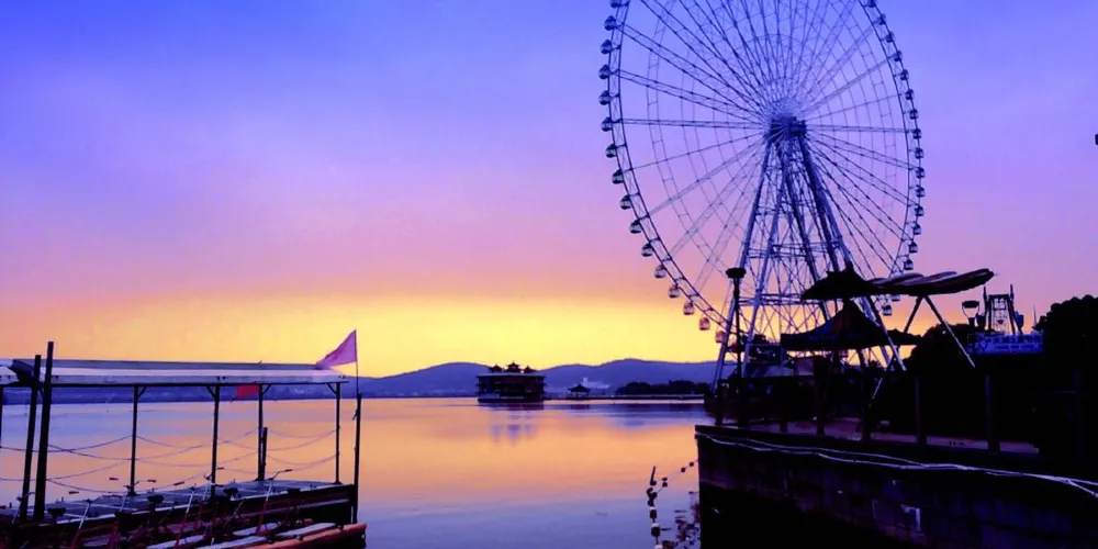 坐船回到南堤春曉,往東北方向走,到千步長廊。這是蠡園的老建築物,跨在蠡湖上,一側是牆,另一側臨水,牆上80個鏤空花窗圖案各異,十分精美。千步長廊東邊盡頭有湖心亭“晴紅煙綠”,與亭隔水相望的凝春塔紅磚青瓦,小巧而色彩對比強烈,是蠡園的標誌性建築之一。在蠡園的東部區域,可以比較近地看見東邊蠡湖公園的摩天輪,以蠡園為前景,摩天輪為背景,拍出的照片很文藝。