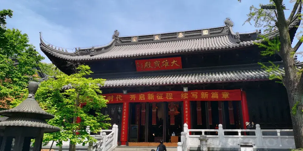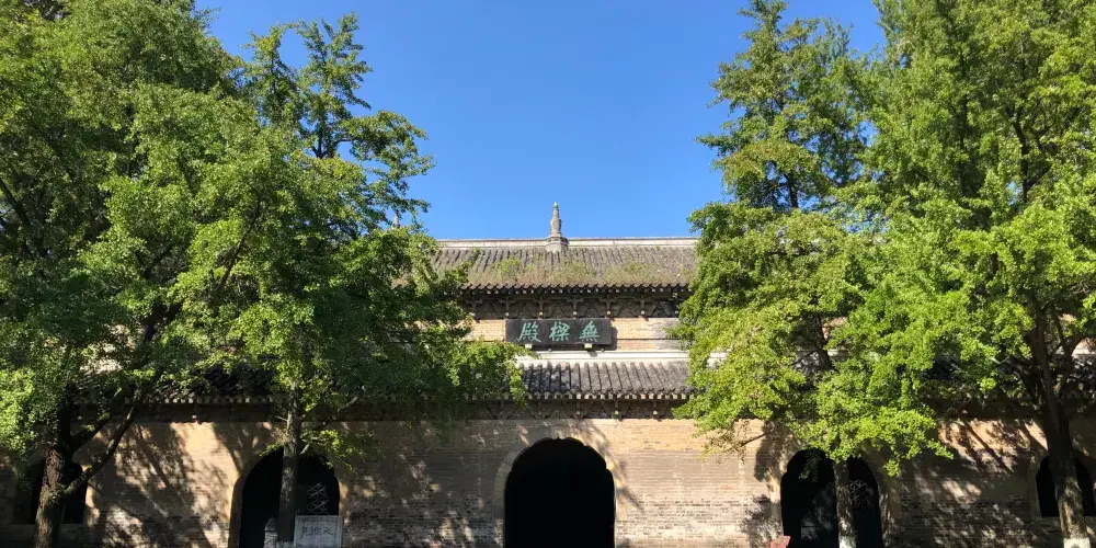 到達景區頂需要爬長長的台階,每過一段台階會有一塊平台以便歇腳。這裡有一個設計上的視覺手法,使你自下而上看時,只見台階不見平台,自上而下看時,只見平台不見台階,你不妨留心一觀。在第五個平台上有兩個大鼎,其中一個鼎壁上還留有日軍侵華時造成的炮彈孔。